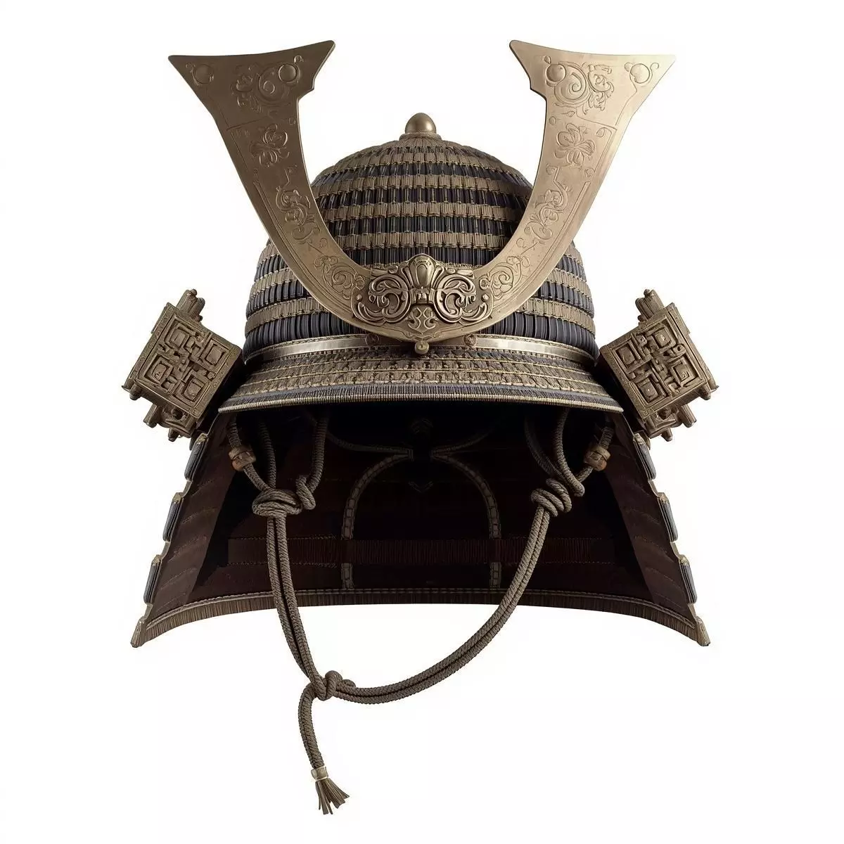 Tagssamurai helmet, kabuto, ancient armor, 3D model, feudal japan, edo period, brass gold, lacquered iron, game ready asset, PBR materials, historical prop