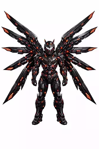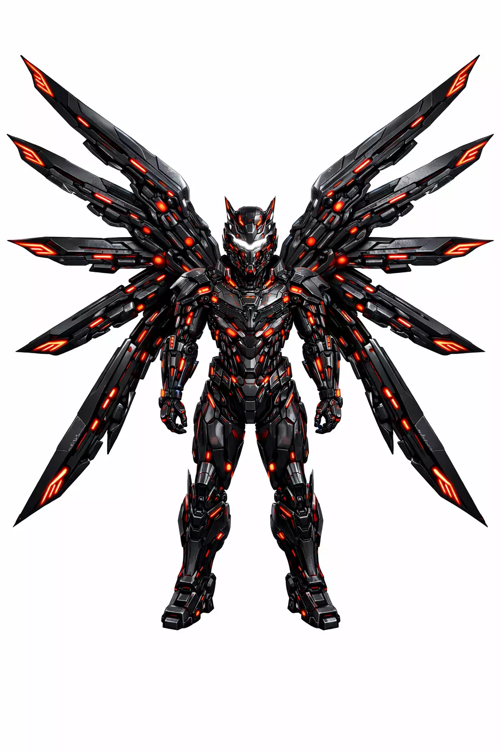La armadura presenta alas cuádruples de gran tamaño, cuidadosamente integradas al diseño para aportar una presencia majestuosa y una silueta distintiva. La paleta de colores en negro, rojo y blanco luminoso refuerza el contraste visual y transmite poder, pureza y determinación. Las superficies muestran un trabajo detallado en volúmenes y formas, manteniendo una apariencia limpia y profesional.