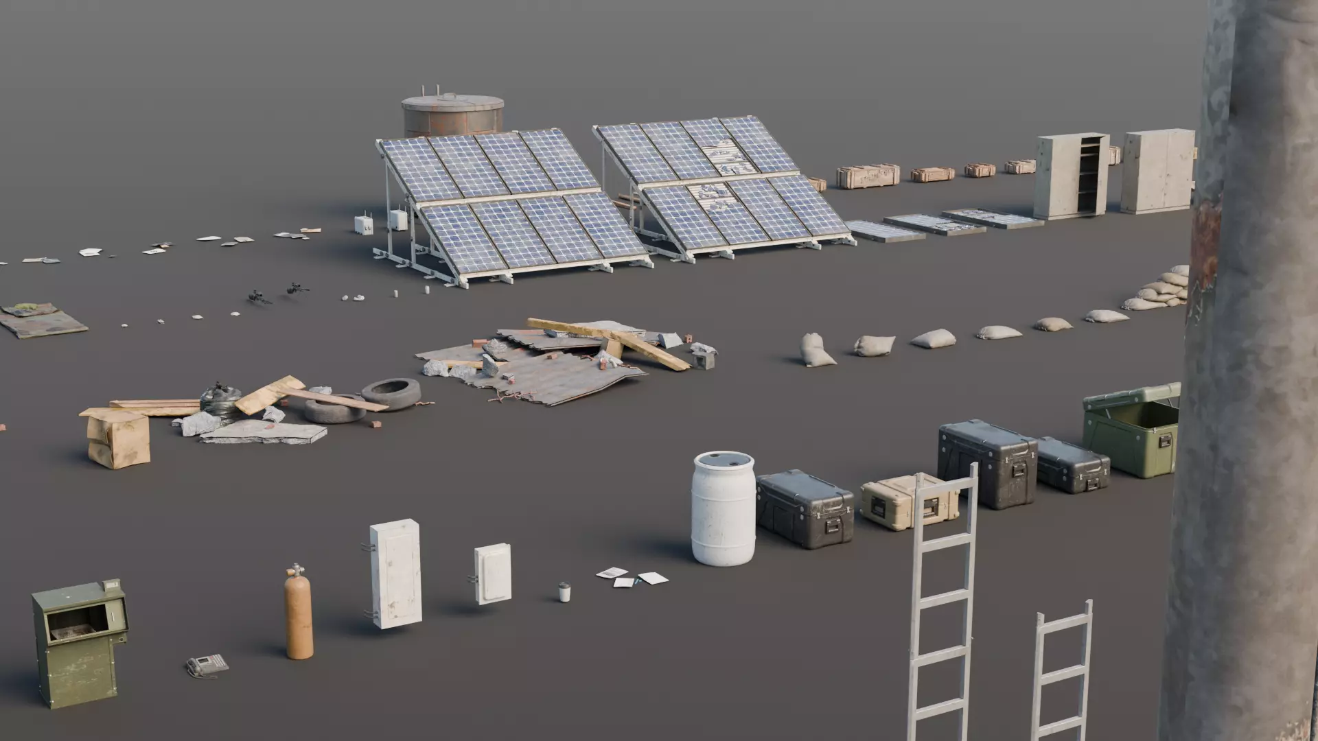 Object List:Air Filter — 1Airconditioner — 3Ammo Box — 3Antenna — 4Artillery Container — 3Artillery Round — 2Assault Rifle — 1Autoclave — 1Band Aid — 1Band Aid Wrapper — 1Beer Bottle — 3Betting Chips — 5Binoculars — 1Brick — 10Bucket — 1Bullet — 3Cardboard Box — 4Chair — 3Chipped Concrete — 5Cigarettes — 4Cinder Block — 4Communication Tower — 1Computer Tower — 1Concrete Barrier — 8Console — 1Defib — 1Desk — 2Drone — 1Dry Erase Board — 3Dumpster — 4Electrical Box — 2Engine Parts — 7Floodlight — 2Folded Table — 1Frag Grenade — 1Gas Pump — 1Gas Tank — 8Gauze Box — 1Gauze Wrapper — 1Generator — 2Glock — 1Gurney — 1Keyboard — 1Ladder — 4Lamp — 5Laptop — 1Log — 1Machine Gun Turret — 1Magazzine — 2Med Container — 1Metal Barrel — 4Metal Barricade — 4Mine — 1Missle — 2Missle Rack — 2Molotov — 1Molotov Kit — 1Monitor — 1Mousepad — 1Newspaperstand — 1Office Phone — 1Oxigen Tank — 1Panel Board — 2Paper Cup — 1Papers — 1Plastic Barrel — 1Plastic Crate — 8Plastic Jug — 4Playing Cards — 5Portable Patient Monitor — 1Portable TV — 1Remote Turret — 1Rock — 3Rubble — 9Sand Bags — 13Satellite — 2Security Camera — 1Sink — 2Sleepingbag — 2Snack — 4Sniper Rifle — 2Soda Can — 3Solar Panel — 5Storage Cabinet — 2Stretcher — 1Surgical Tool — 6Table — 1Tires — 3Toilet — 1Tool Box — 2Tools — 10Trash Bag — 2Trash Papers — 7Ultrasound — 1Vitals Monitor — 1Water Tank — 1Wood Board — 9Wooden Crate — 7Wooden Pallet — 2