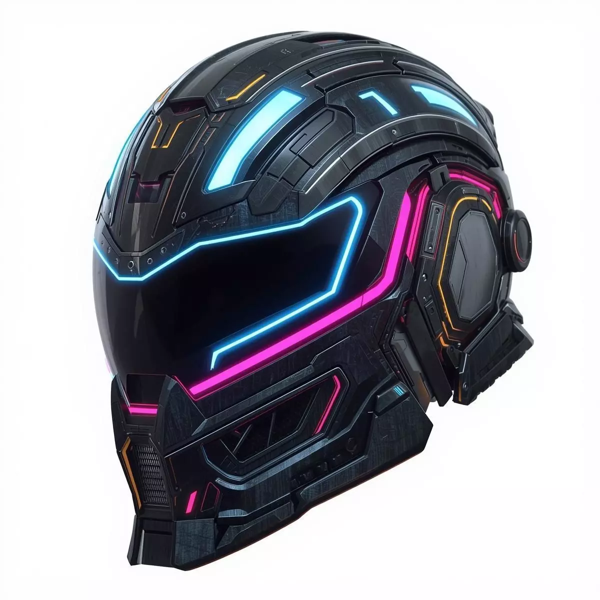 Key FeaturesMulticolor Neon Interface: Features a wide, wraparound digital vizor with cyan and magenta LED light strips, designed to simulate advanced augmented reality (AR) or heads-up display (HUD) systems.