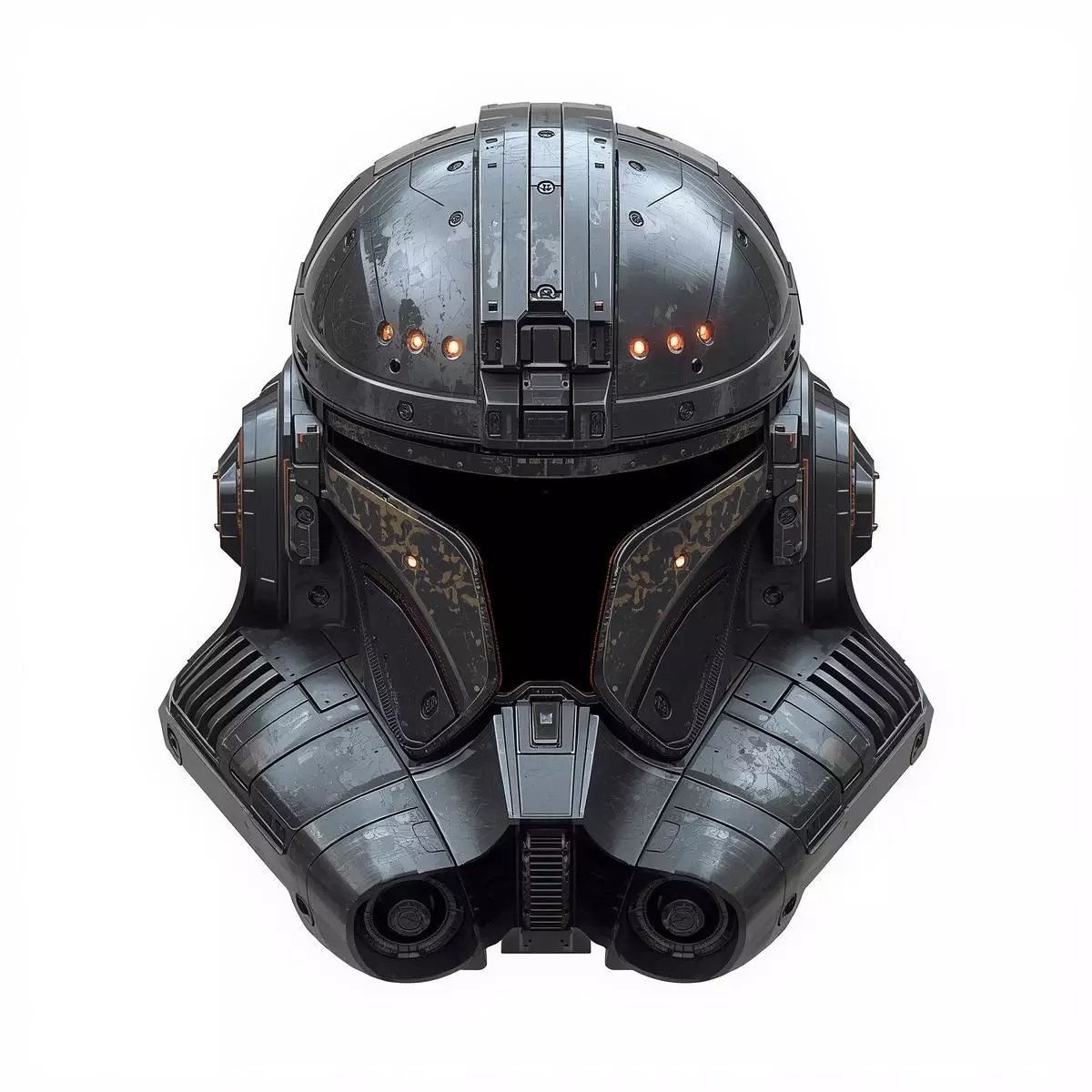 Integrated Communication Hubs: The sides of the helmet are equipped with circular modular ports and hexagonal bolt detailing, suggesting high-bandwidth neural-link or encryption capabilities.