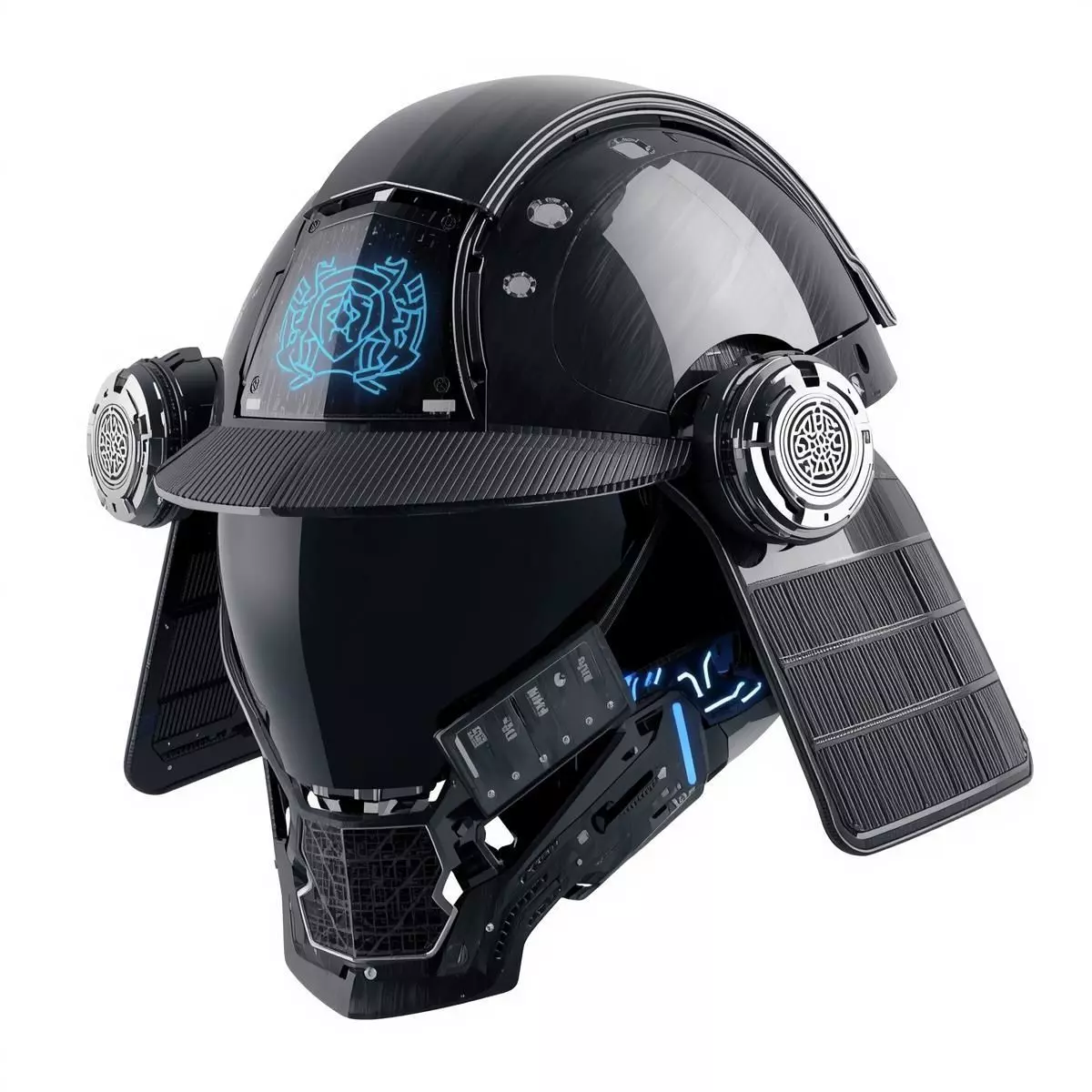 Integrated Cyber-Menpo: Includes an advanced lower face protector with a cyan-lit hex-grid respirator and technical data-ports along the jawline.