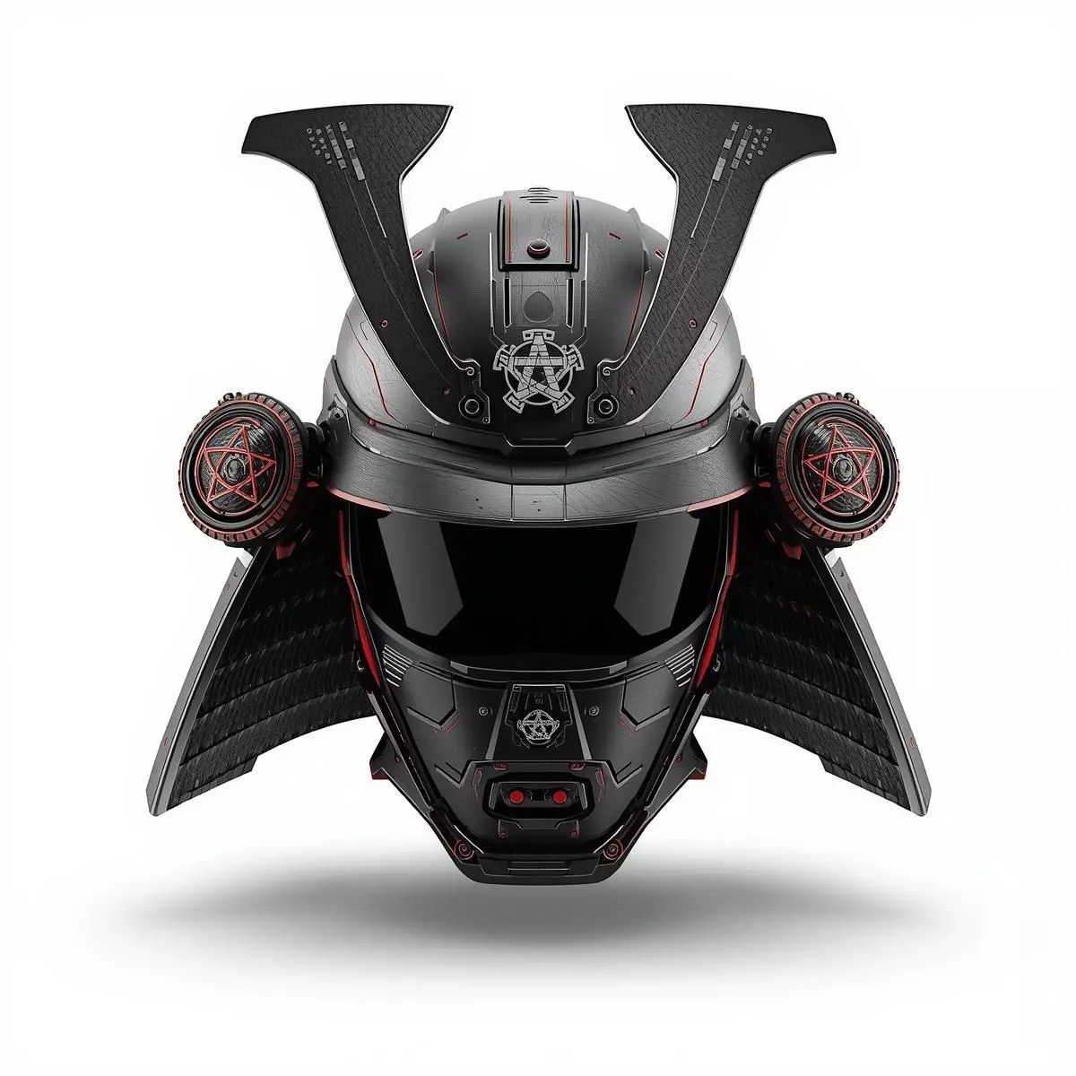 Integrated Cyber-Menpo: Includes an advanced lower face protector with dual red-lit optical sensors, recessed intake vents, and circular structural ports for life support or comms.
