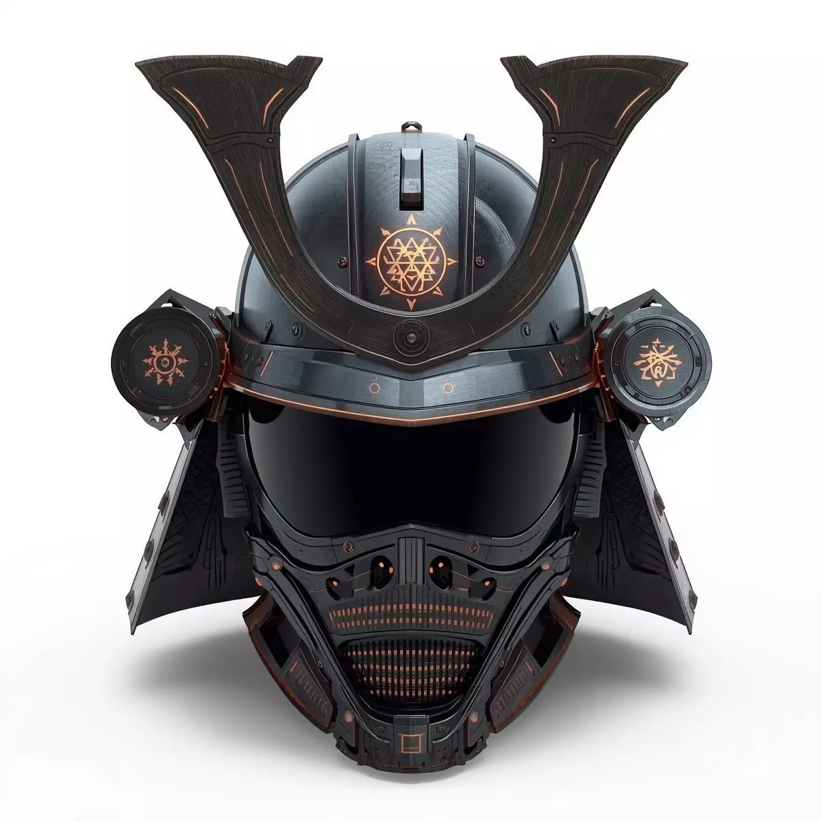 Tagscyber samurai, tactical kabuto, futuristic armor, 3D model, copper neon, sci-fi headgear, ronin tech, game ready asset, PBR materials, obsidian metal