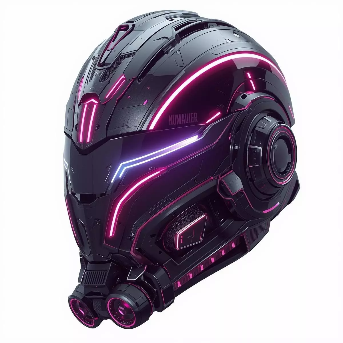 Key FeaturesFuturistic Luminescent Vizor: Features a sleek, multi-layered digital visor with a brilliant magenta and white internal glow, designed to simulate advanced augmented reality (AR) or digital optics.