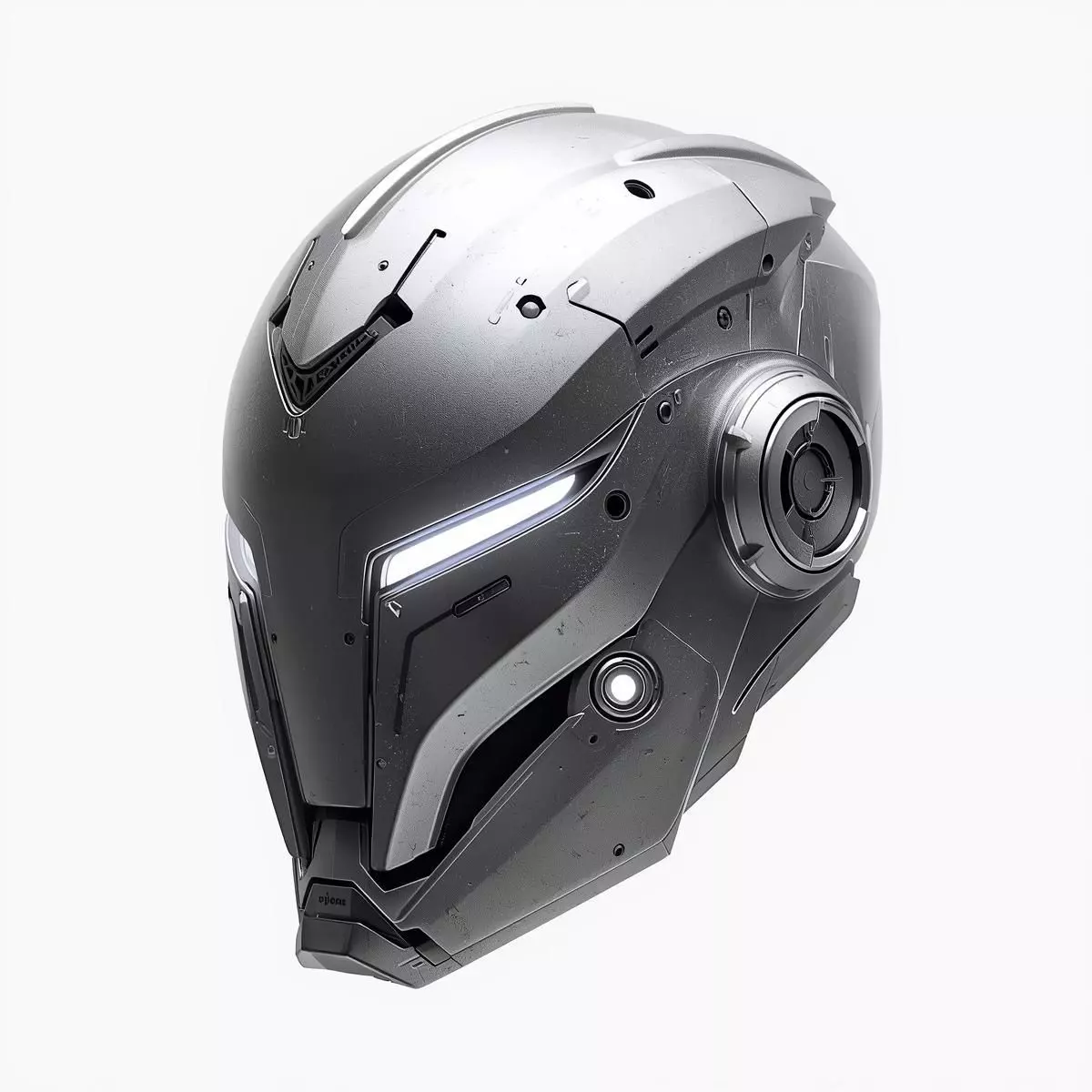 Precision Technical Detailing: The shell is composed of multi-layered plates with visible panel lines, cooling vents at the jawline, and recessed sensor ports.
