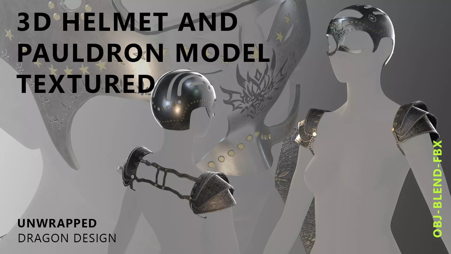 Dragon helmet and paildron whit clean mesh . 3d model of helmet and pauldron are in 2 separate files . vertex:9700 face:9700 Textures are available in 4k for PBR Metallic/Roughness Model is available in FBX, OBJ and blender