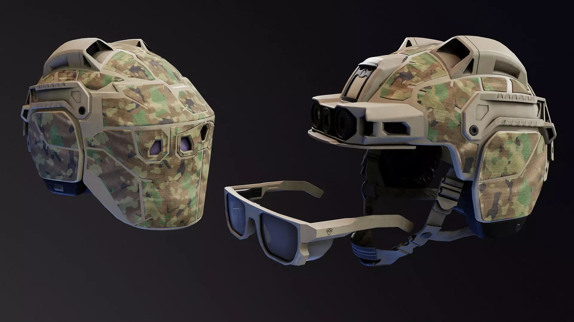 There are two variants of it, one with AR glasses/camera sensors and one with full face cover with VR display. I also decided to make those camo patches as separate meshes. It's easier to put your own camo on them and when I make them as bumps on the main helmet it looks a tad weird in some angles.