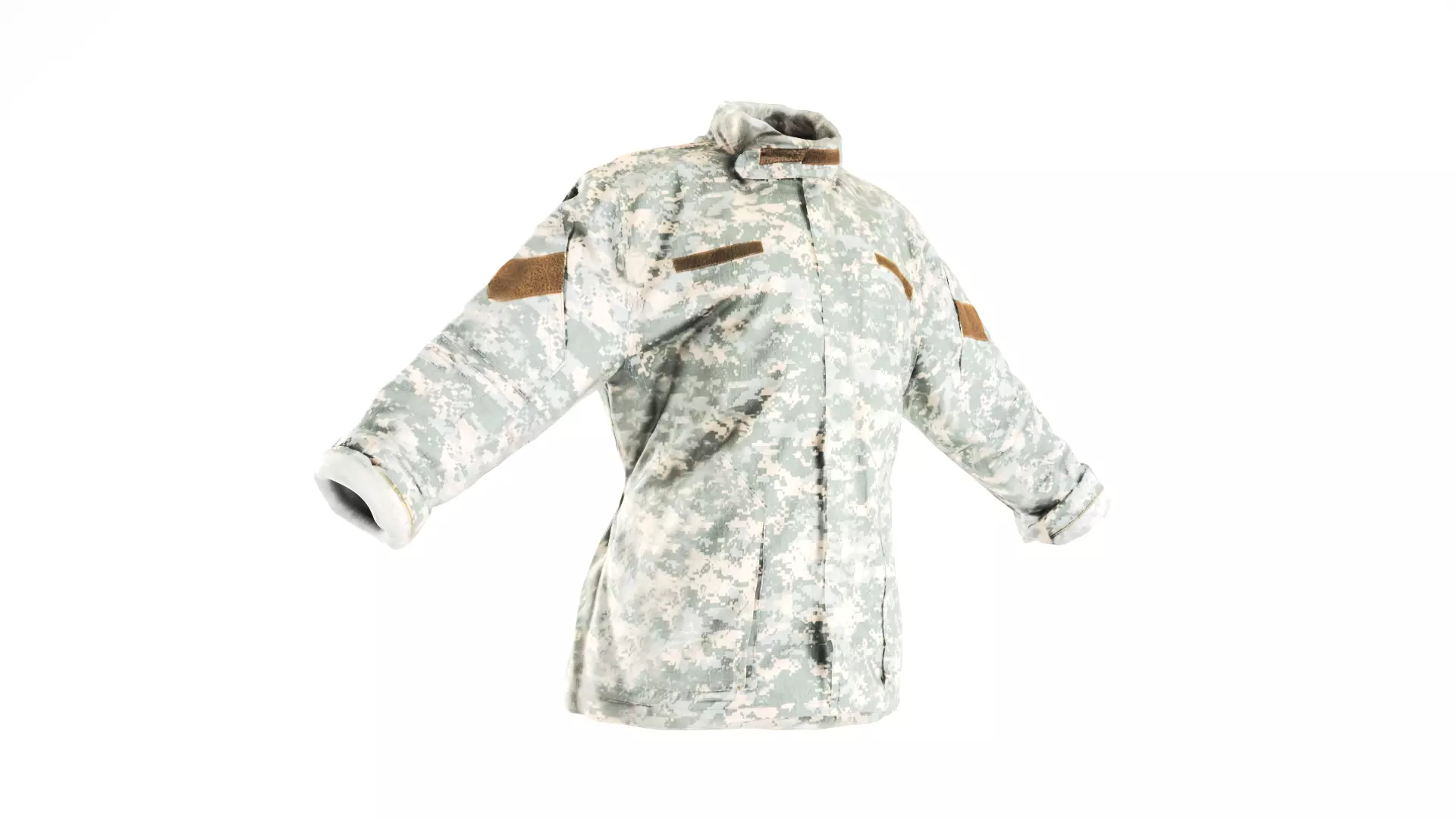 This is a true human size and detailed model of a male jacket of an american camouflage uniform. The jacket is suitable for average model of size S, M, L. May be slightly adjusted for better fitting.