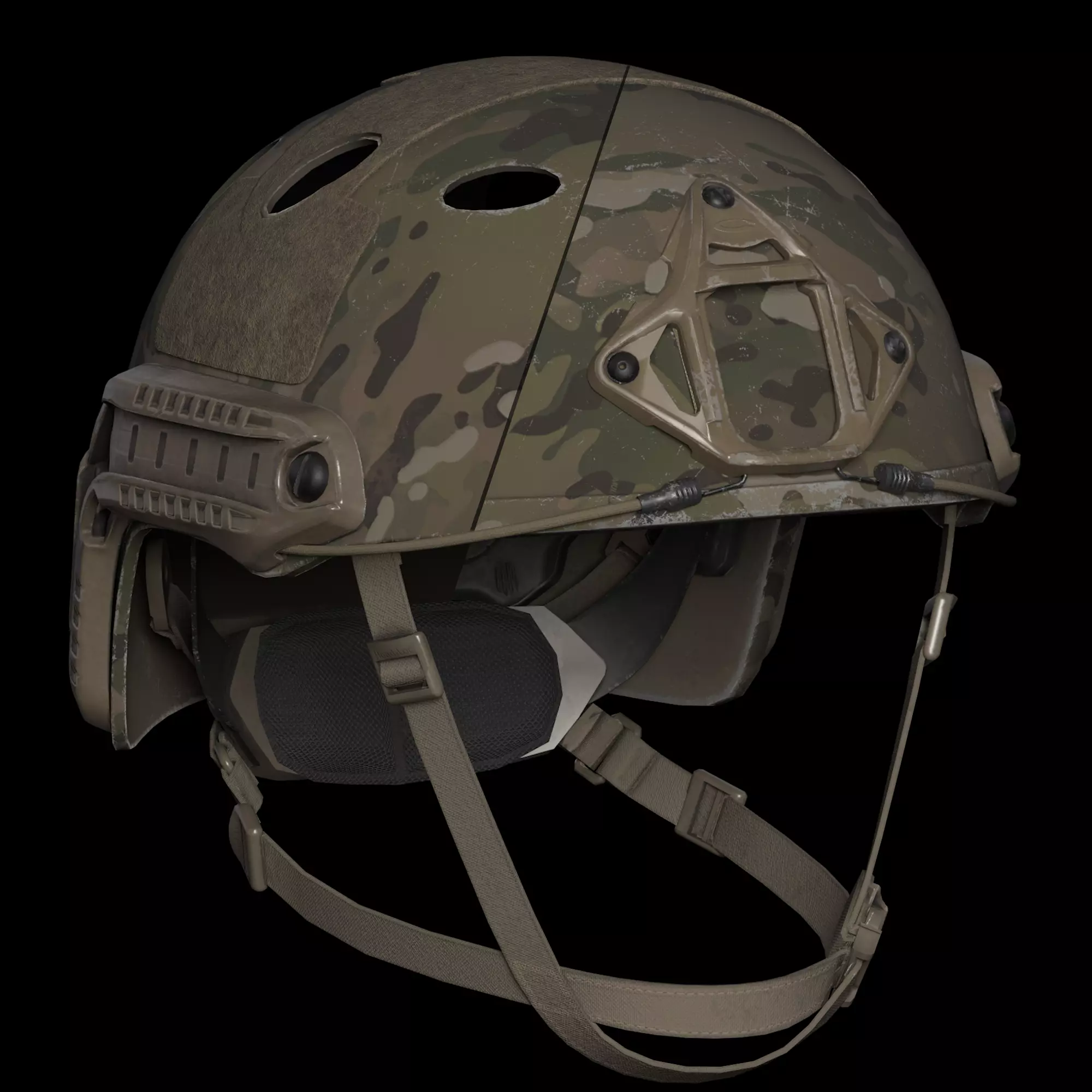High cut shell made of a hybrid composite of Carbon, uni-directional Polyethylene, and Woven Aramid. Raised ear cut allows for integration with communications headsets. Features an Ops-Core 3-Point Skeleton Shroud for universal capability with most NVG mounts, Accessory Rail Connectors (ARCs) with hook bungees, and external VELCRO brand loop. Scalable design allows for compatibility with Ops-Core visors, mandibles, handgun face shields, and ballistic appliques.