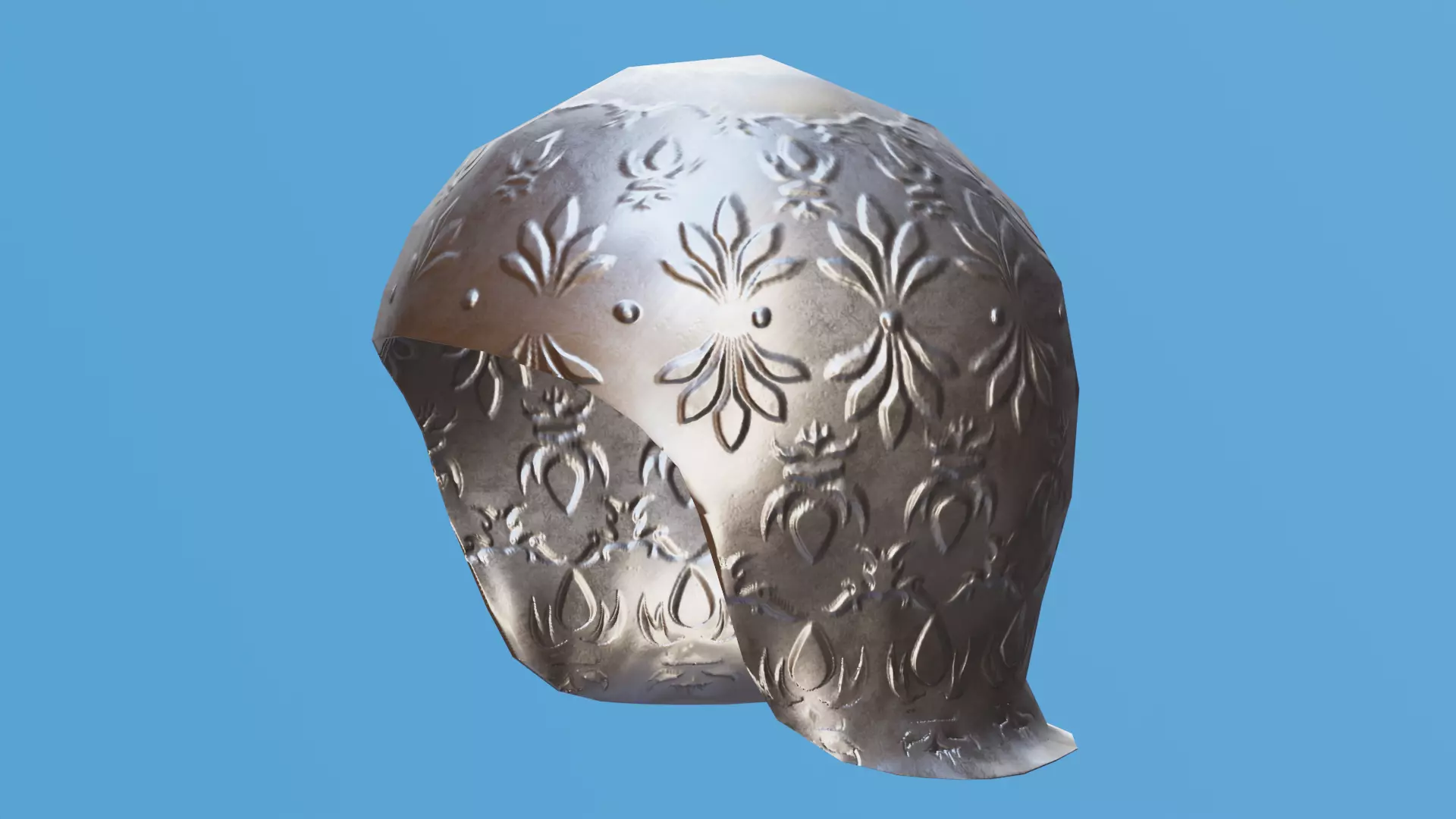 This is a high quality realistic 3D Blender model of a ornate open sallet.