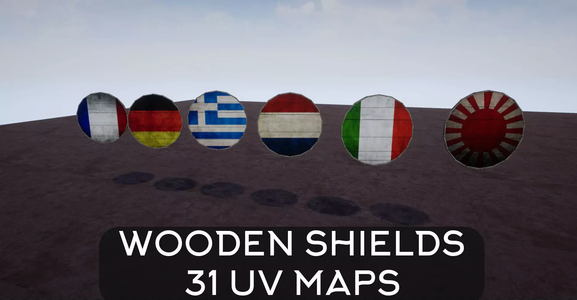 there are 7 painted wooden textures with UVs.there are 24 different country flags textures with UVs.I added some example UVs to the gallery you can look up there.