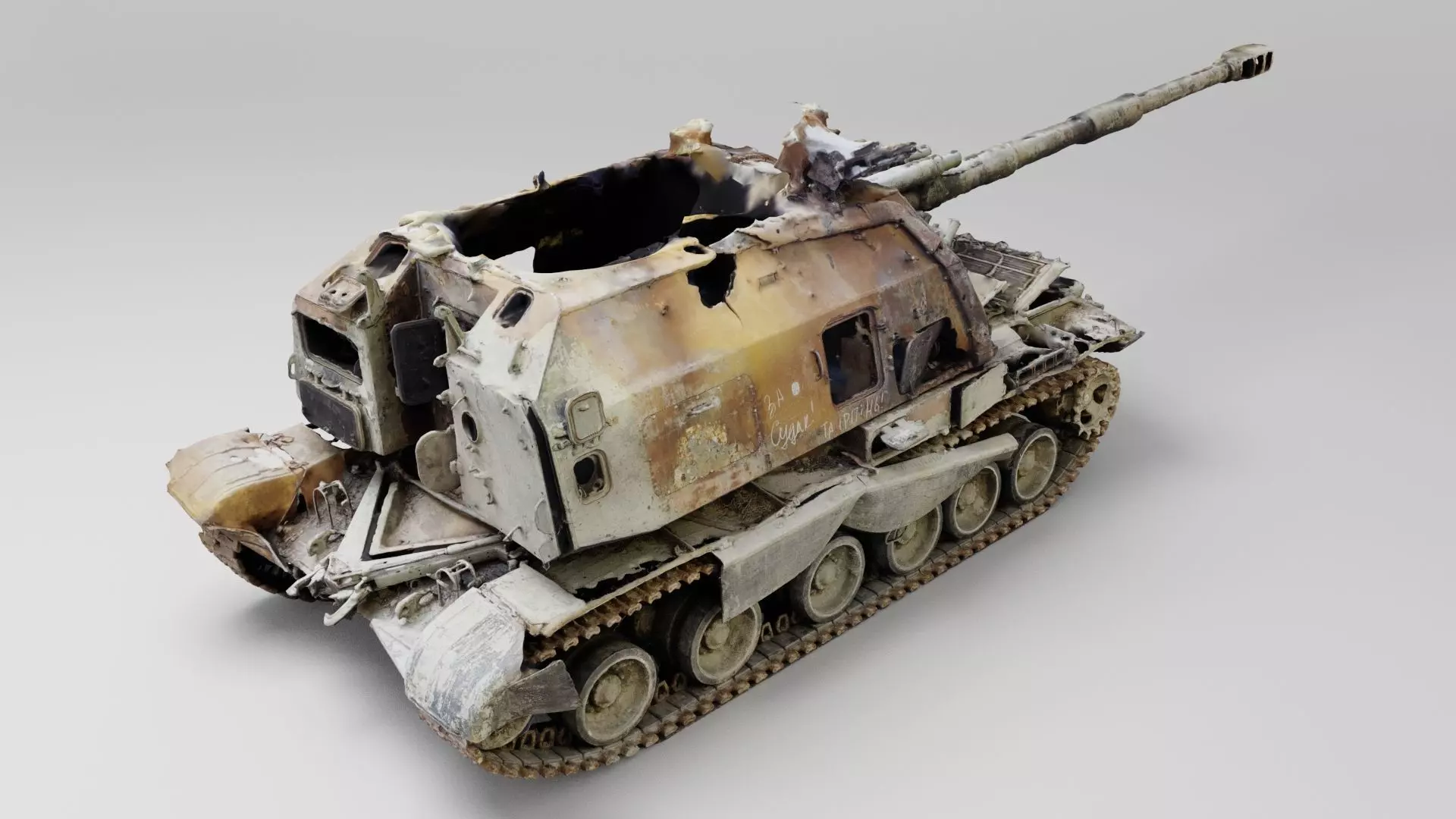 russian 2S19 Msta 152.4 mm self-propelled howitzer destroyed by Ukrainian military during russian occupation of Ukraine, 2022 war in Ukraine. Please support Ukrainian artists.