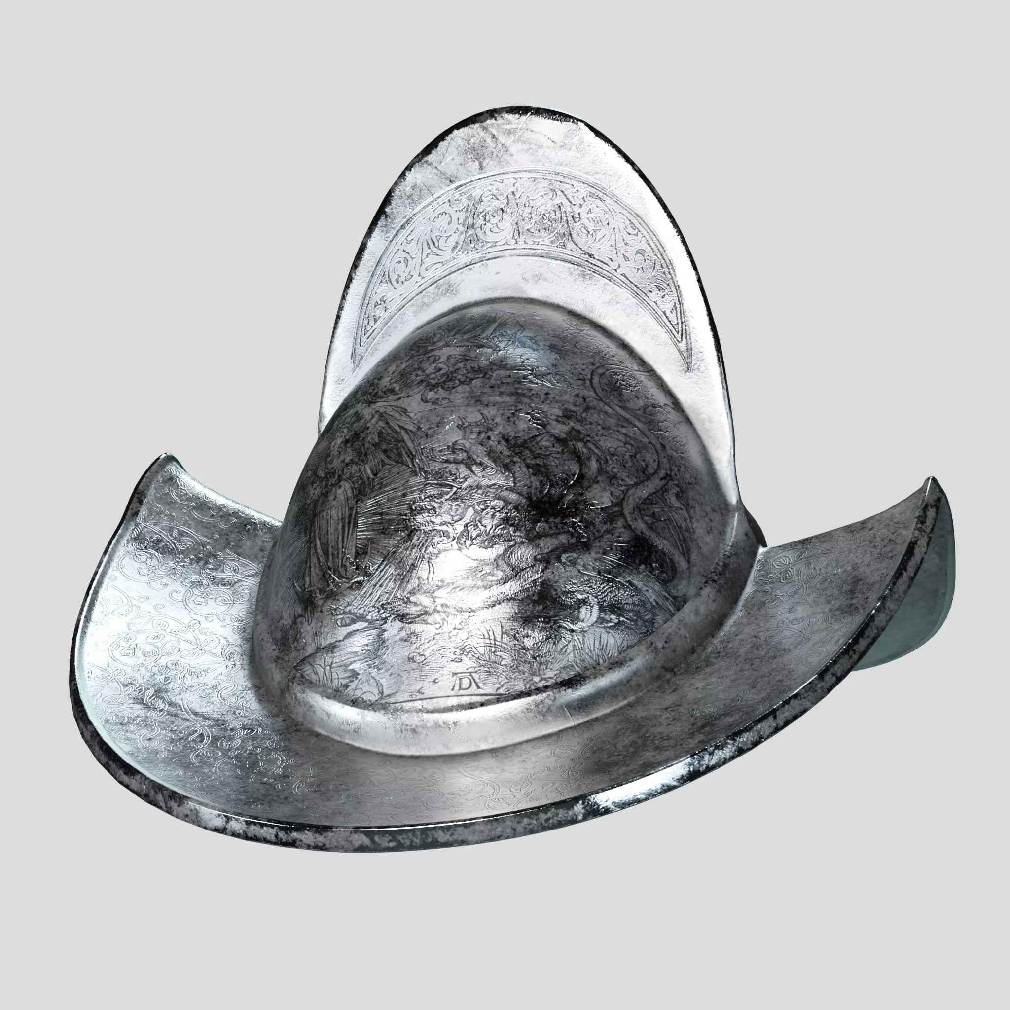 This is typical spanish steel morion helmet. The engraving is a piece by Albrecht Dürer, which might not be historically accurate but it looks cool. Textures are 4K.