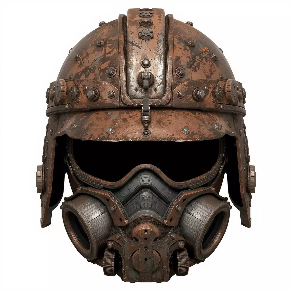 Tagssteampunk helmet, tactical gas mask, industrial 3D model, weathered metal, rusted texture, heavy armor, game ready asset, retro-futuristic, PBR materials, mechanical headgear