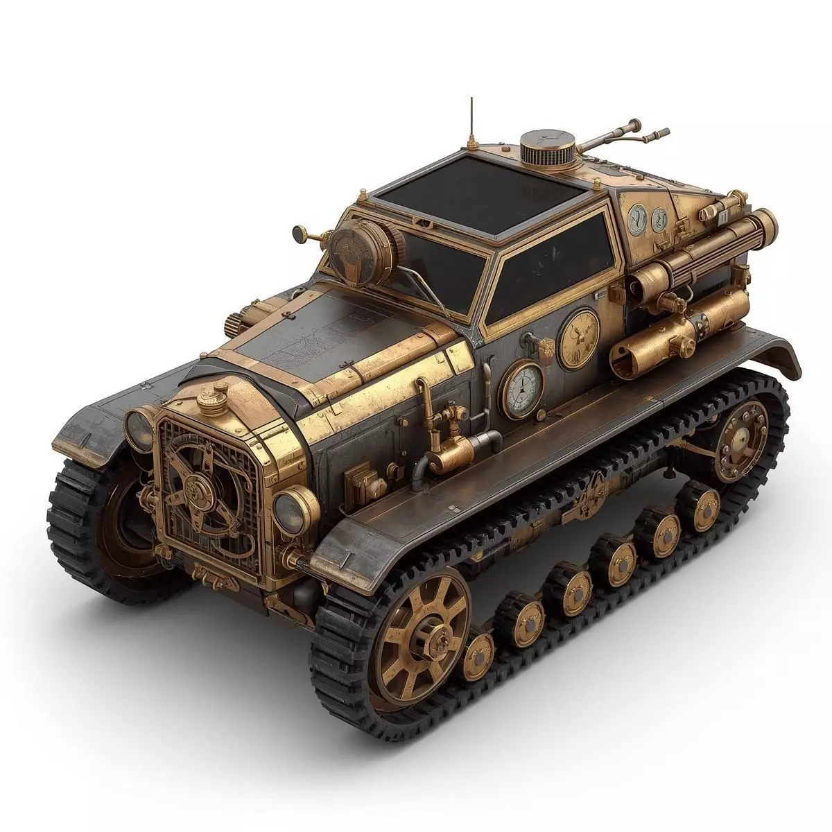 Tactical Details: Includes side-mounted steam pipes, specialized storage canisters, and a small rooftop turret or hatch for combat-ready visualization. Tagssteampunk, armored vehicle, scout car, tank, half-track, victorian, industrial, brass, iron, steam engine, treads, machinery, vehicle, 3d model, game asset