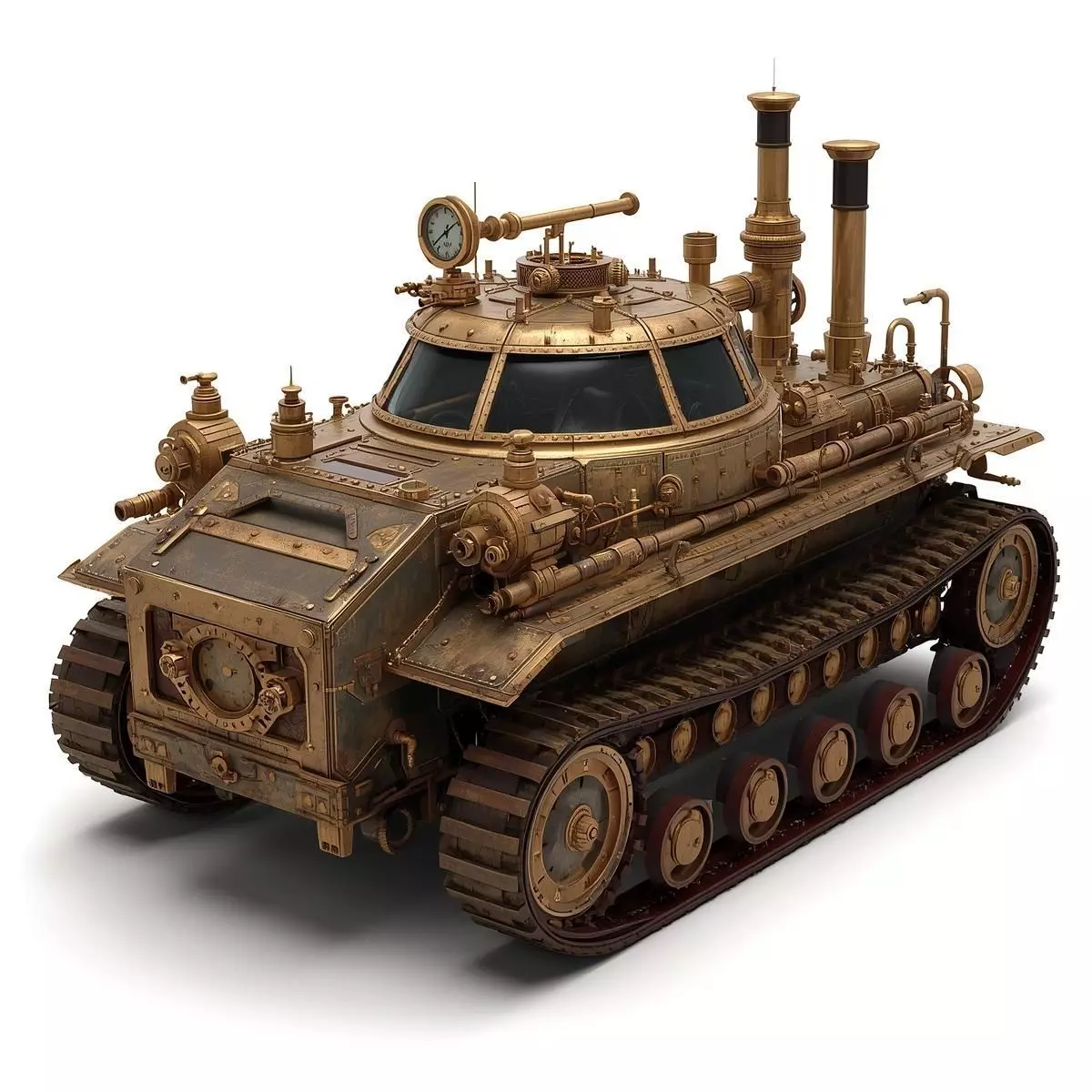 Side-Mounted Armament: Features stylized mechanical turrets and exposed rotating gear assemblies that highlight its retro-futuristic power source.Tagssteampunk, tank, armored vehicle, light tank, victorian, industrial, brass, iron, steam engine, war machine, treads, machinery, vehicle, 3d model, game asset