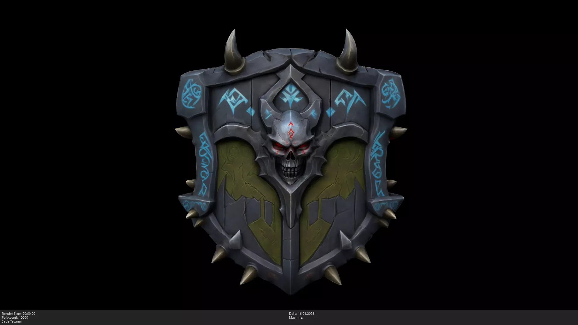 Arcane Details: The shield is inscribed with hand-painted glowing blue runes and features a menacing horned skull boss that radiates dark power.