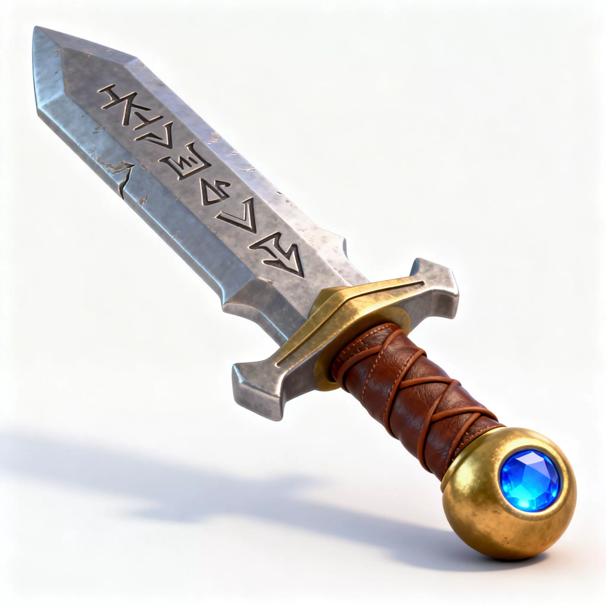 Tagssword broadsword stylized fantasy weapon medieval blade glowing gem rune rpg game prop asset iron gold leather magic combat knight