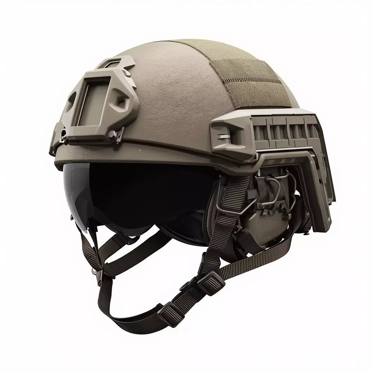 Integrated NVG Shroud: Showcases a front-mounted bracket designed for securing Night Vision Goggles or other head-mounted optical devices.