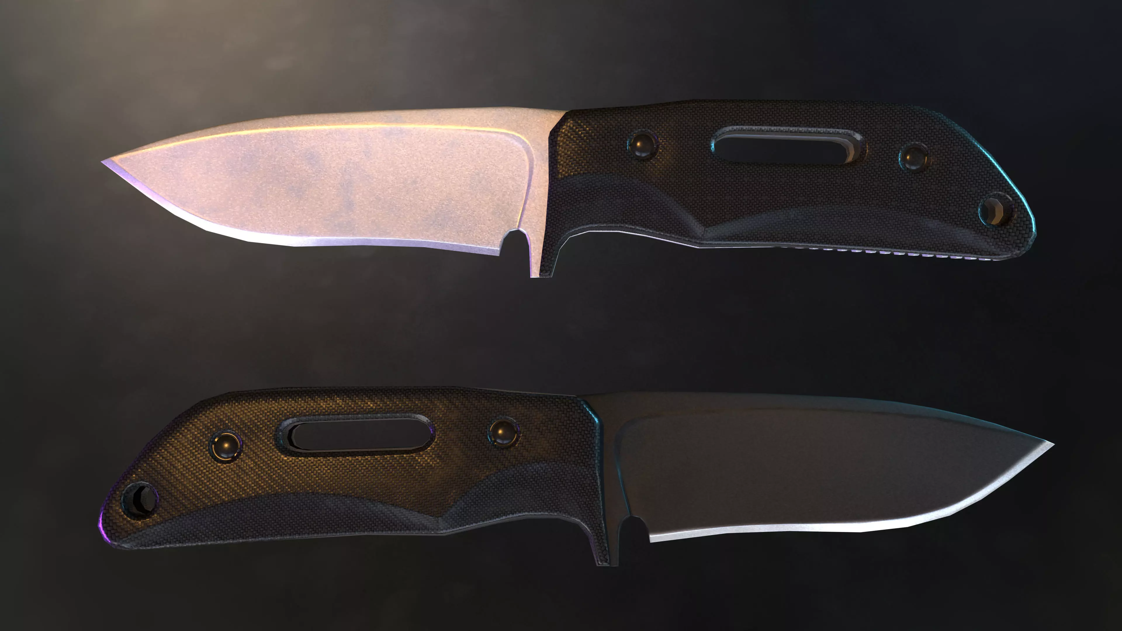 A Very Detailed Low Poly tactical Combat Knife with High-Quality PBR Textures. The blade has a detailed electric process steel, and the handle is covered in a black carbon fiber material.