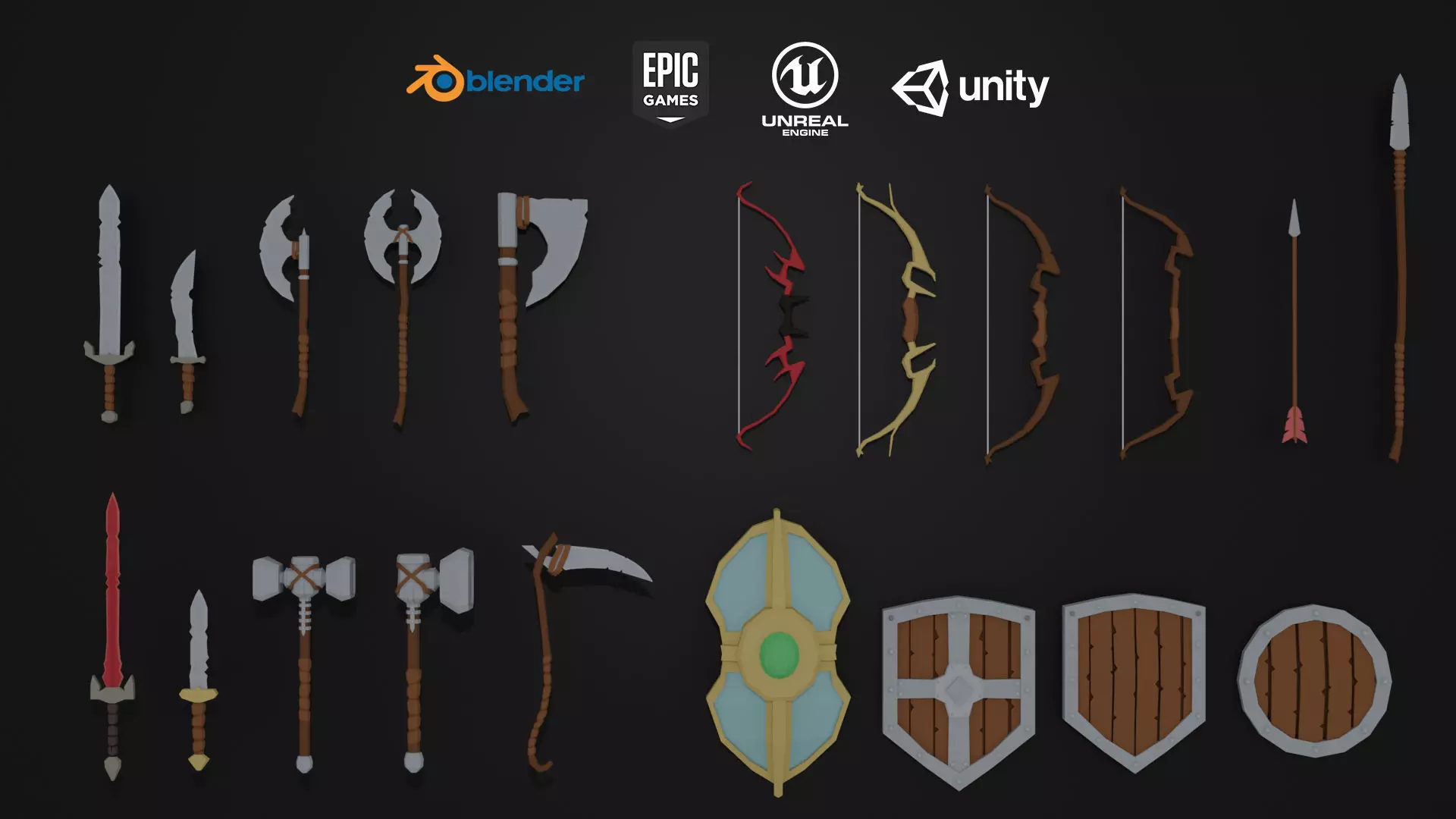 Features:Low Poly Design: Each model averages 512 faces, ensuring excellent performance for mobile, PC, and console platforms.Game-Ready Assets: Fully compatible with Unity and Unreal Engine for seamless integration.Included Formats: Blend, FBX, OBJ, and GLB, providing flexibility across multiple workflows.Wide Variety of Weapons:Swords: Medieval and fantasy-inspired designs.Axes: Battle axes, Viking-style, and double-edged.Bows and Arrows: Versatile designs for different game aesthetics.Hammers and Scythes: Heavy-duty weapons for combat-focused games.Shields: Round and rectangular shields with intricate designs.Specifications:
