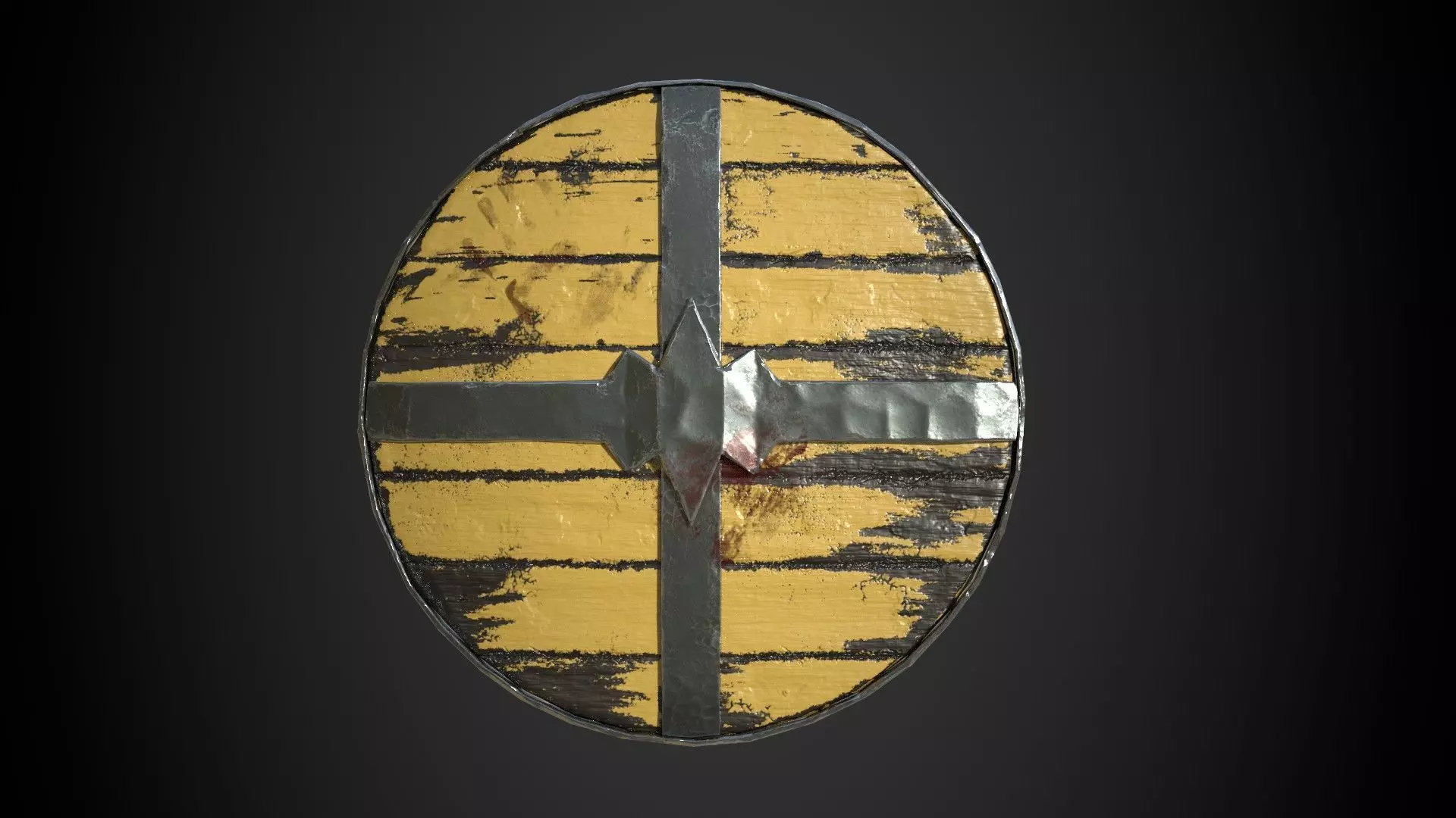 Hello, their! Here is a Viking historical yellow shield. Viking style round shield, steel boss, bolted steel rim, and arm strap. In the Viking age, fighting men used large, round, wooden shields gripped in the center from behind an iron boss. Shields represent one of several instances where the literary sources and archaeological sources do not agree on how Viking weapons were constructed. The Norwegian Gulaþing and Frostaþing laws specify the construction of a shield. The shield should be made of wood with three iron bands and a handle fastened to the backside by iron nails. A later revision of the law says that the shield should be made of a double layer of boards (tvibyrðr), and the front should be painted red and white. A few shields have survived from the Viking age, notably the shields from the Gokstad ship, which date from the 10th century. The ship was equipped with 32 shields, several of which survive intact. They were made from a single layer of planks butted together, with no iron bands, and the fronts were painted black and yellow.Typical Viking shields were 80-90cm (32-36 inches) in diameter. Some were larger, such as the Gokstad shields, which were 94cm (37in) across. Based on surviving remnants, some shields appear to have been as small as 70cm (28in) in diameter. Presumably, when a man-made a shield for himself, he sized it to fit his body size and fighting style. A shield needs to be big enough to provide the desired protection but no bigger. A shield too small exposes additional lines of attack that an opponent might exploit, while a shield too large slows the defensive responses and exhausts the fighter unnecessarily.All the surviving examples are made from solid butted planks, although literary evidence, such as the 10th century Frankish poem Waltharius, and the Gulaþing laws, suggests that shields were made of laminated wood. No archaeological evidence supports this style of construction during the Viking era in Norse lands.Surviving shields are made from spruce, fir, or pine. Again, literary evidence contradicts and suggests that shields were made with linden wood (Tilia, commonly known as basswood in North America). The word lind (linden) is used to mean shield in poems such as Völuspá (50), and the term lindiskjöldr (linden shield) is used in some sagas. Linden certainly has advantages over other species of wood for shield use. It is lightweight and does not split as readily under impact as do other types of wood.