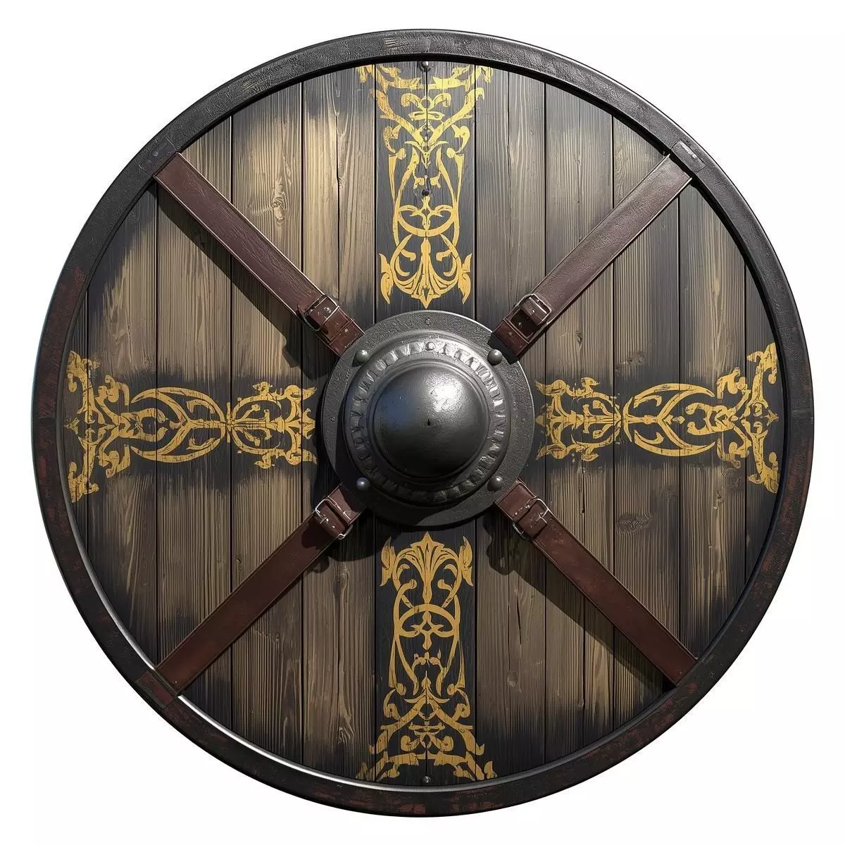 This high-quality 3D asset features a Viking Round Shield, meticulously designed to represent a battle-worn defensive armament from the Nordic era.