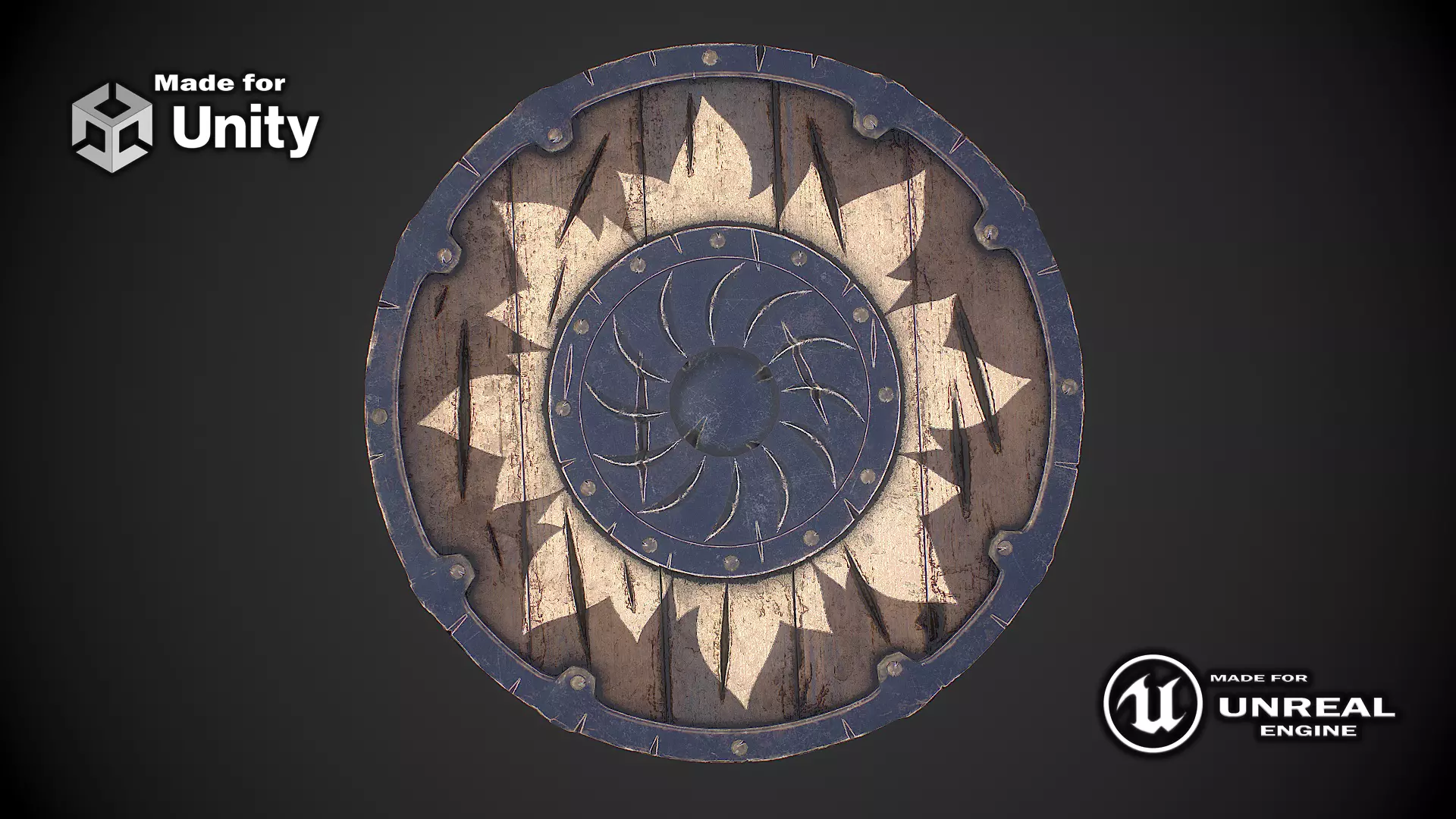 Hello. This is a high definition quality polygon of a Viking shield 3d model with PBR textures. Extremely detailed and realistic. Suitable for movie prop, architectural visualizations, advertising renders, games and other. The archive includes Obj and FBX, textures for the Unity: Base color, Height, Metallic, Mixed AO, Normal_OpenGL, Roughness. And also included in the archive textures for UE: BaseColor, Normal, OcclusionRoughnessMetallic. The number of materials correspond to the number of main objects in the scene. The model contains 1 objects: Viking_shield. If you need, we will make a file of this model for 3D printing especially for you. Original file size: 321 MB. Archive file size: 133 MB.