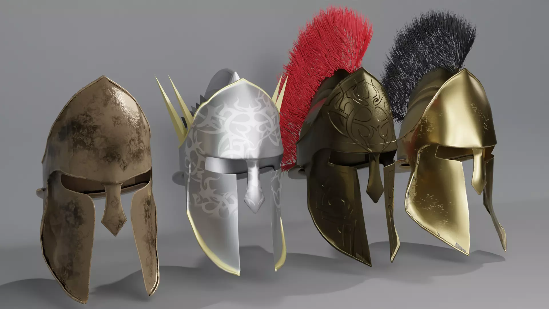 Warrior Helmet 3D Model Pack – 4 Variants (Feathered Included)This high-quality 3D asset pack features 4 unique warrior helmet models, including 2 helmets with decorative feathers, perfect for use in games, cinematic projects, historical scenes, or fantasy worlds. Each helmet is modeled with clean topology and uses 1K PBR textures for an optimized balance of detail and performance.
