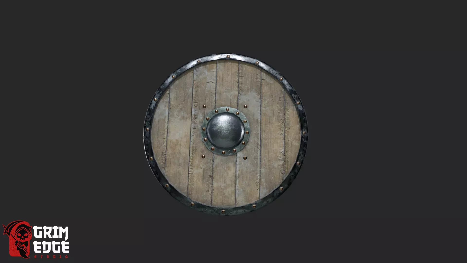 A classic wooden medieval shield reinforced with metal, ideal for warriors, guards, and bandits in historical and fantasy settings.