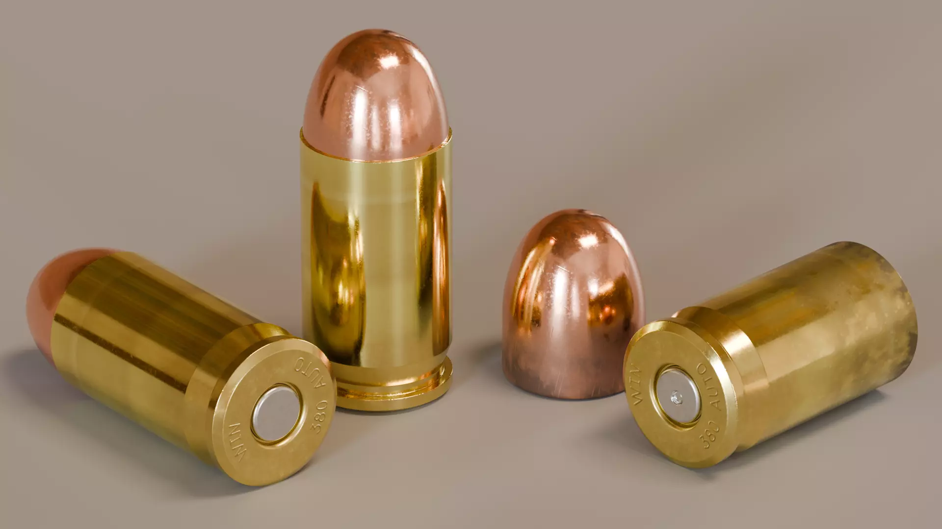 This is a dimensionally accurate, photorealistic model of a .380 ACP (.380 Auto) cartridge that includes both an unfired cartridge and the components after firing. The detail in the model extends only to surfaces that can be seen externally after manufacturing or after firing, though the unfired projectile and unloaded cartridge (with primer installed) can be used as standalone assets, too.