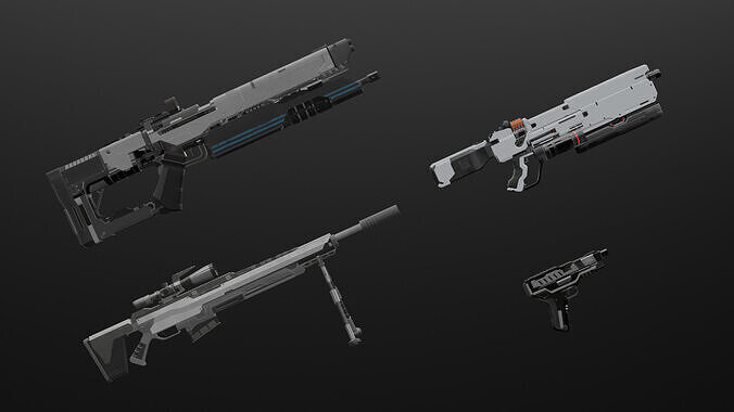 Four completely rigged Scifi Guns ready to use for your projects. Each contains a baked texture for easy rendering-compatable with Eevee and Cycles rendering in Blender. Each gun has a rig with moving parts for ammo loadouts, muzzle ricochet and various Scifi parts for a sense of realism.