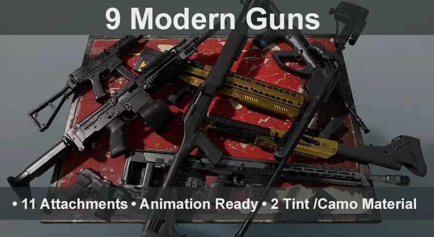 This pack includes 9 high quality modern weapons and 11 attachments. All are set up in PBR and with and camo pattern tiling in Unreal Engine. Art assets formats are FBX and TGA. Also included is a UE5.1 sample scene with all meshes, textures, and materials set and ready to go. Simply migrate all the content into your project! No premade animations are included. The all models are well optimzed for all platforms. The weapons have very minimal/no working internal parts.
