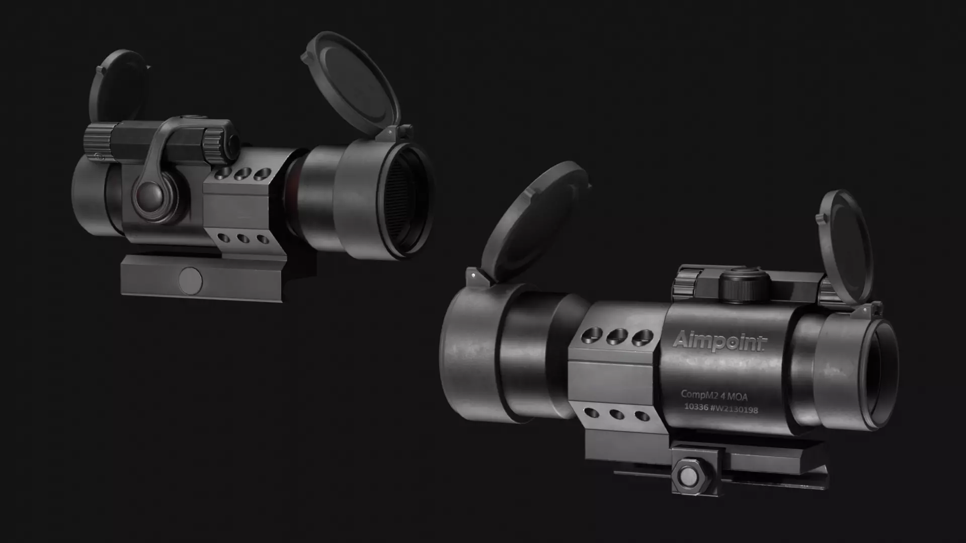 • 3 Assigned Materials on 1 UV map each: (aimpoint_compm2, aimpoint_lens, reddot)