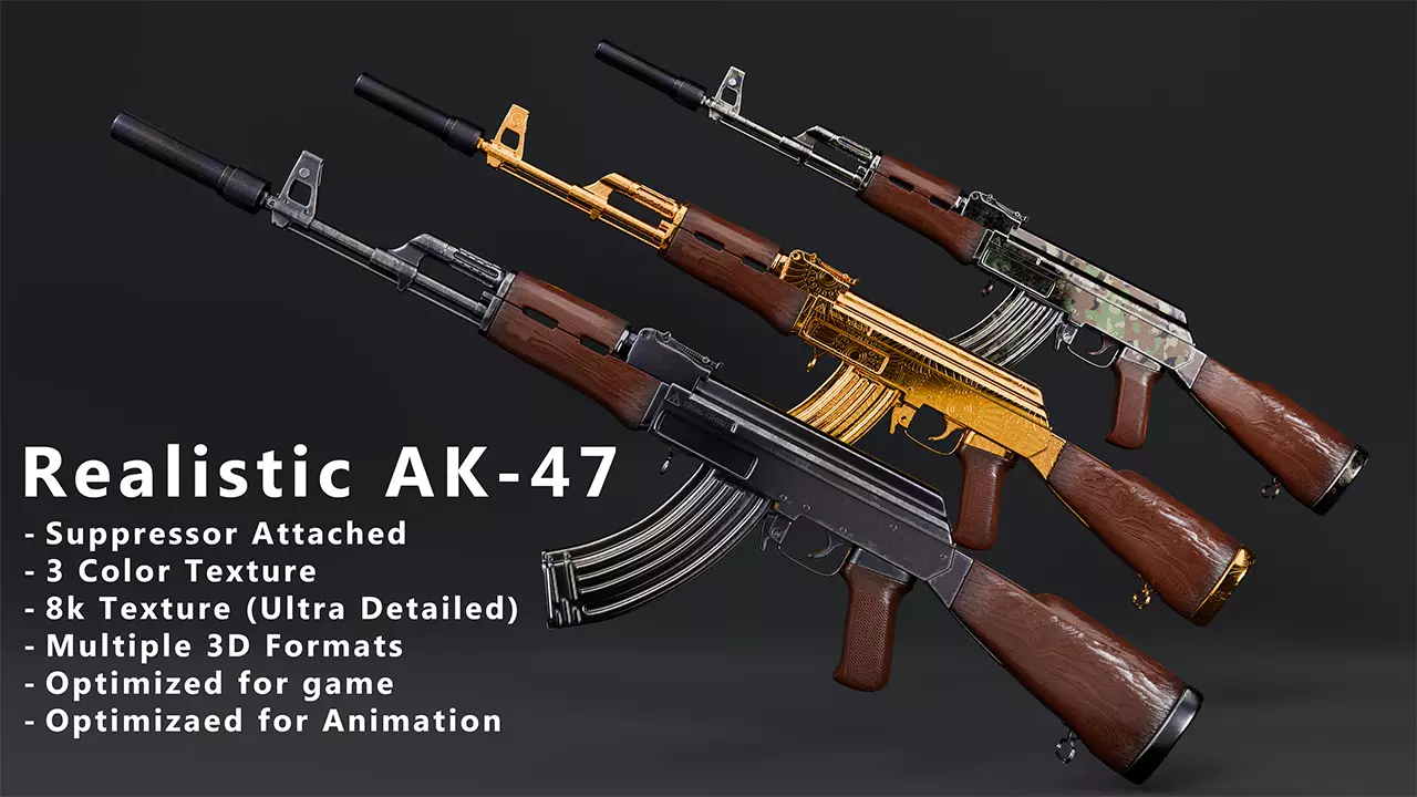 High-quality, game-ready AK-47 3D model with three 8K PBR texture sets: Factory Default, Gold, and Camouflage. Fully UV-unwrapped, optimized topology, and ready for games, VR, or cinematics.