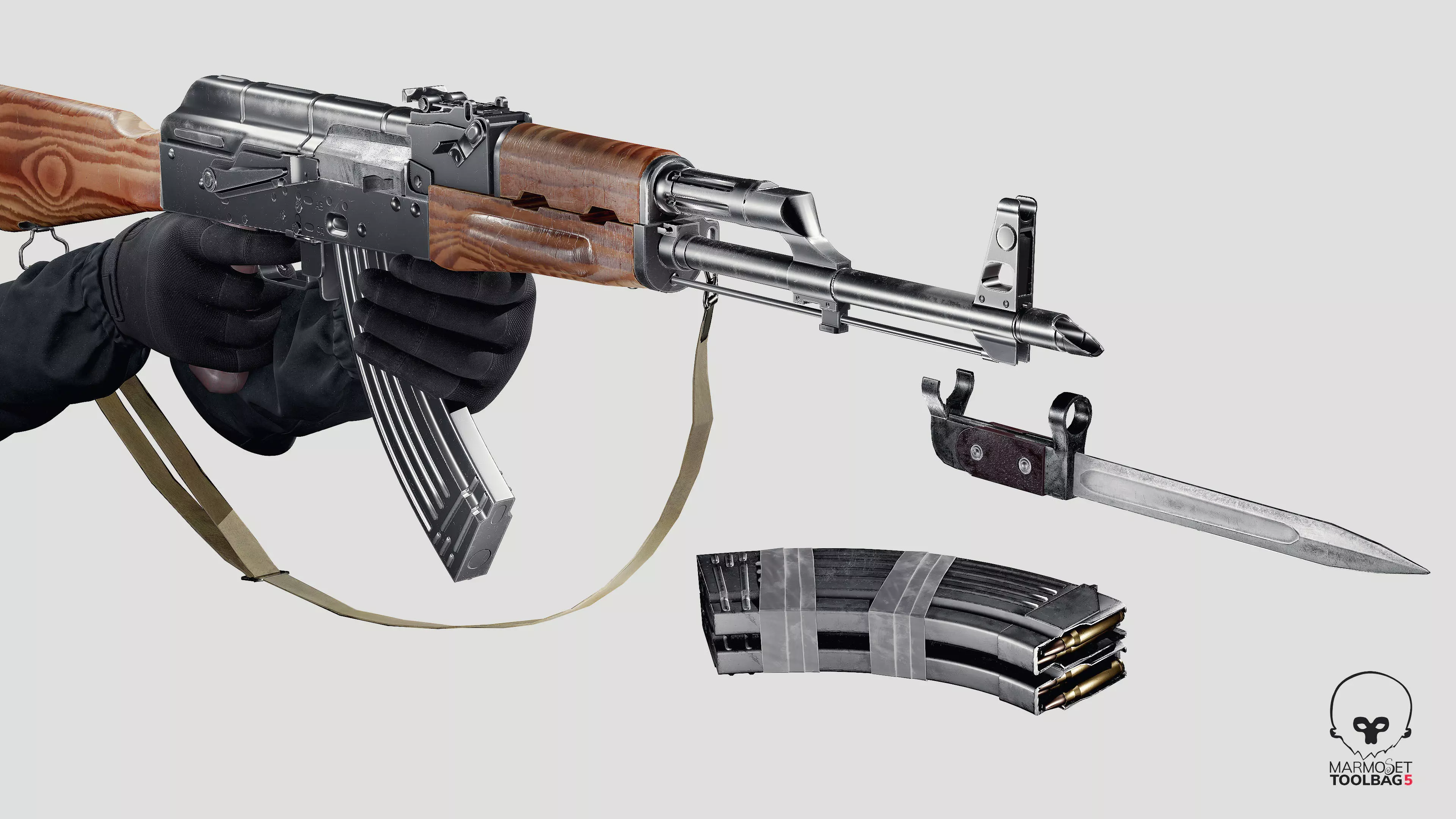 This is a game-ready AK-47 model that includes additional items such as a knife, belt, bullet, and tape for a double magazine. The model features two sets of 4K textures for the gun and magazine, while the extension models come with 2K textures, allowing you to create multiple versions of the gun. I hope you like it!