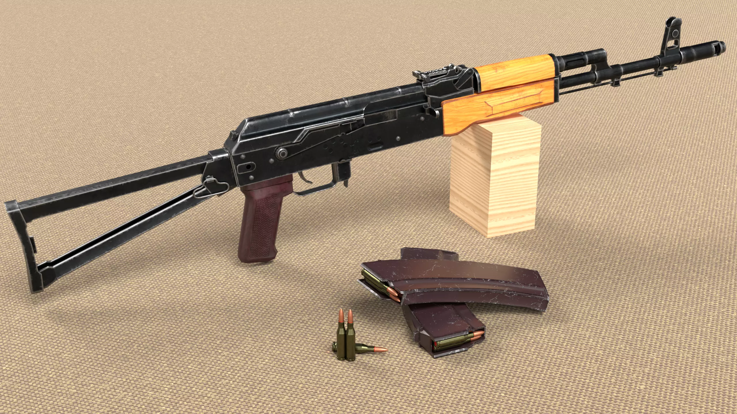 The AKS-74 is a variant of the AK-74 equipped with a side-folding metal shoulder stock, designed primarily for use with air assault infantry and developed alongside the basic AK-74. Unlike the AKMS's somewhat fragile underfolding stock (modeled after the MP 40 submachine gun stock), the AKS-74 stock is fabricated from stamped sheet metal struts, machine pressed into a U shape and assembled by punch fit and welding.