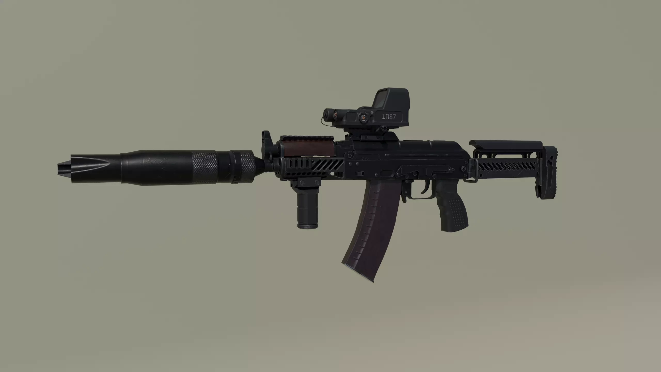 When equipped with the PBS-4 suppressor, the AKS-74U gains enhanced stealth capabilities, reducing both visual and auditory signatures. The Zenitco accessories, such as the B-11 and B-12 handguards, RK-0 hand grip, RK-3 pistol grip, and B-18 Picatinny rail, further enhance the rifle's modularity and customization options. The addition of the PT-1 folding buttstock improves the overall compactness, allowing for ease of transport and deployment in tight spaces. Paired with the 1P87 holographic sight, this modified AKS-74U becomes a versatile and adaptable firearm, well-suited for a variety of tactical scenarios.