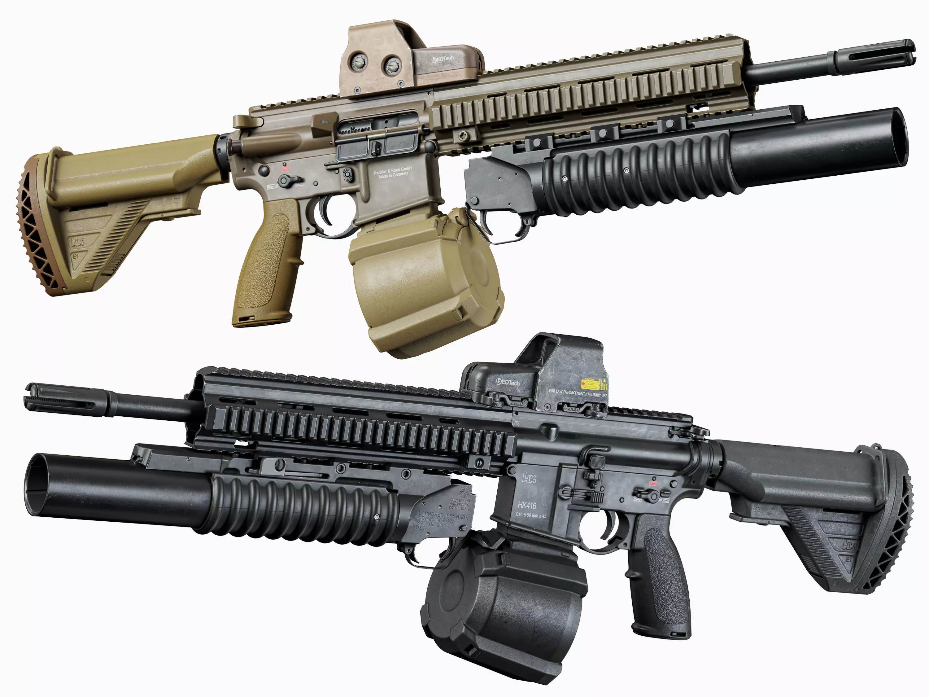 Game-Ready high-quality 3d model HK416 rifle 5.56 × 45 caliber with scope EOTech 553, magazine Magpul PMAG 60 rounds, grenade launcher M203 for Unreal Engine, Unity and other PBR game engines, renderers, first Person Shooters, VR games, and your other projects.