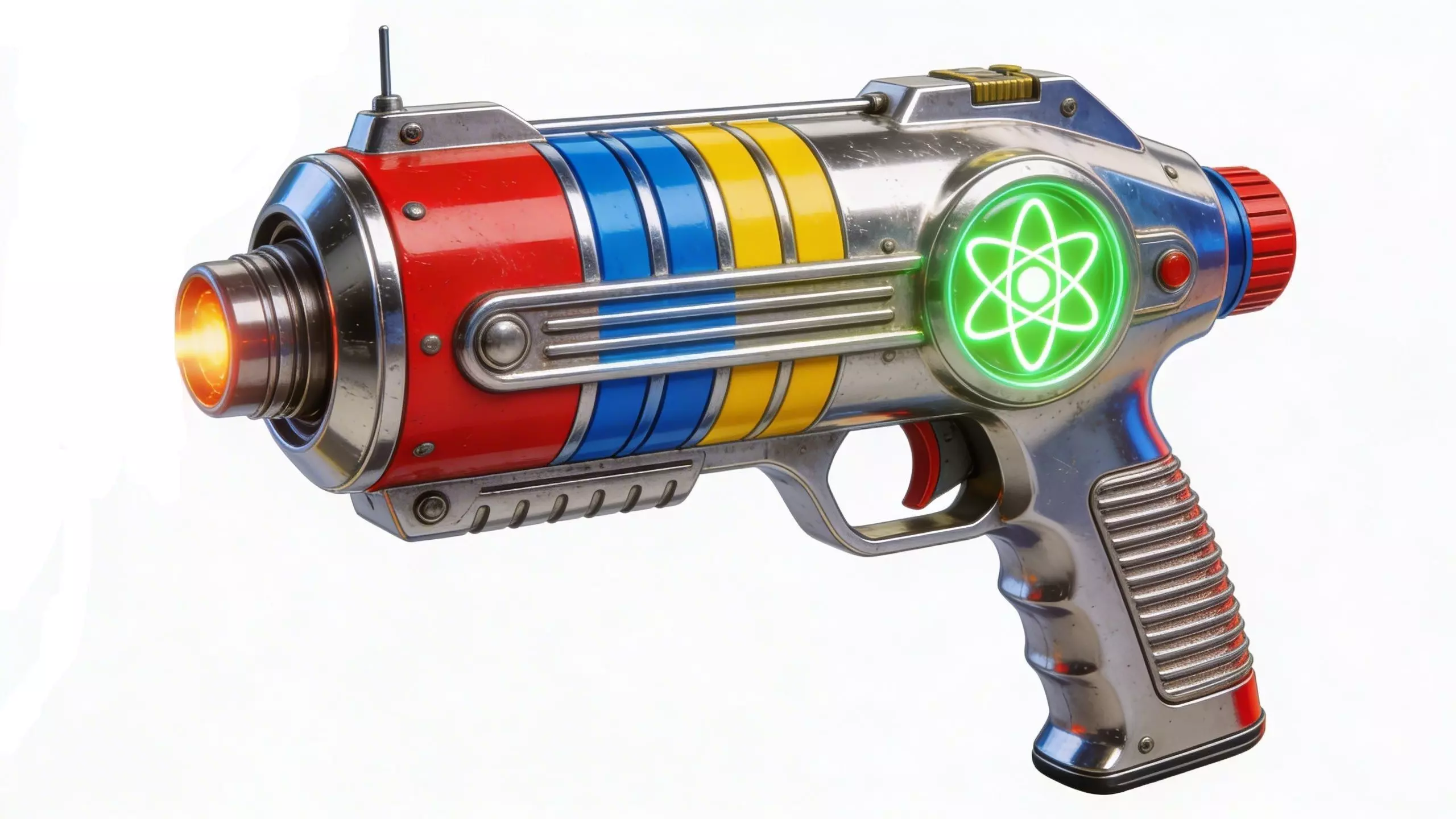 TagsAtompunkRaygunBlaster3DModelRetroSciFiChromeNeonFusionWeaponPBRGameReadyUnityUnrealLowPoly4KFuturisticVintagePropElectronic