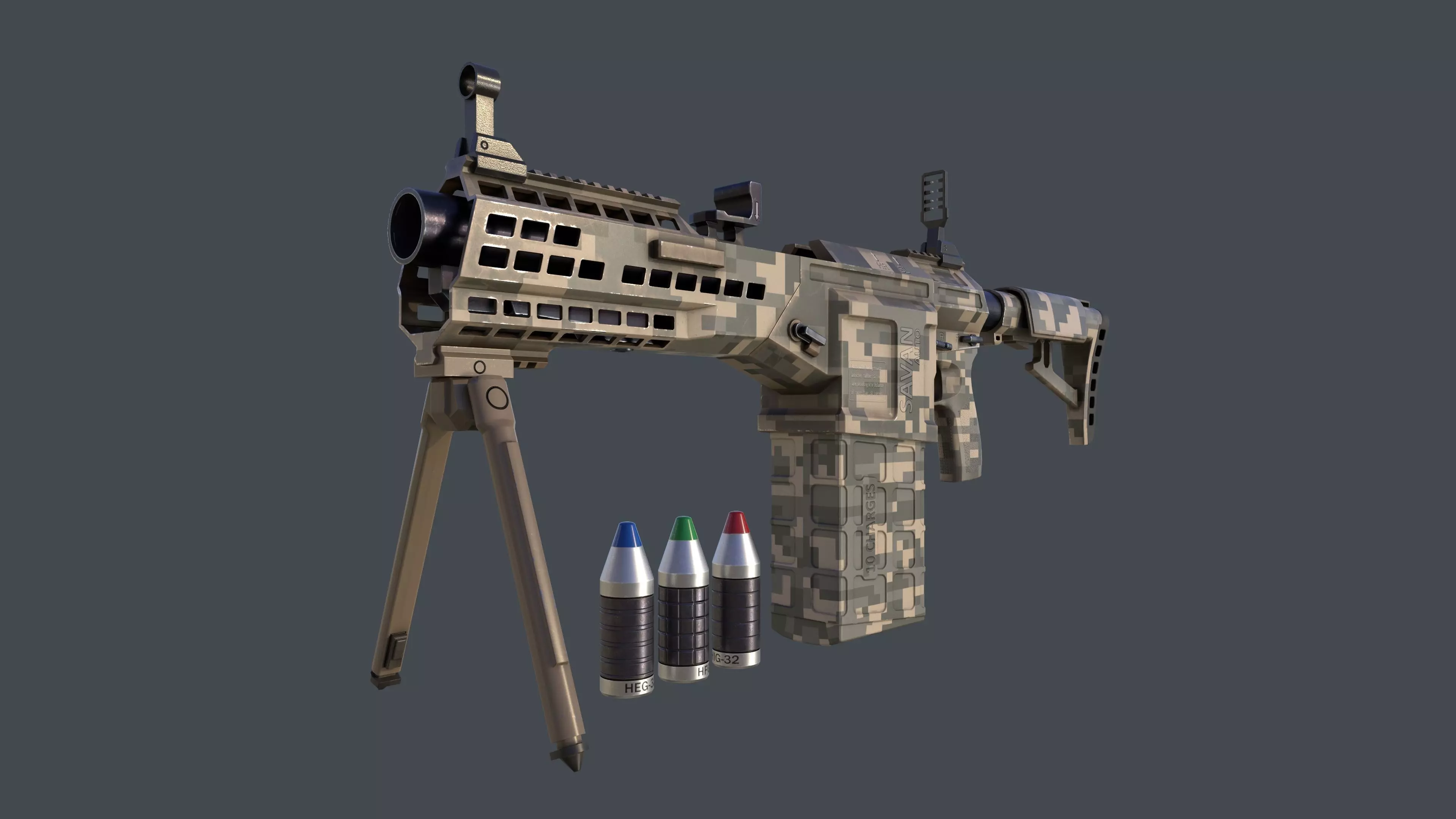 3d lowpoly model of an automatic grenade launcher caliber 32 mm. Principle of operation: Equipment from the store, automatic reloading - short rollback of the barrel. Two shutter positions: the first is for manual replacement of a grenade, the second is on the shutter delay from an empty magazine. There are switches on the case: Fuse, Release from the slide stop, Snap off the magazine, Partial disassembly. The length of the grenade launcher is 75 cm. The model comes with a magazine for 10 grenades and three types of textures for grenades.