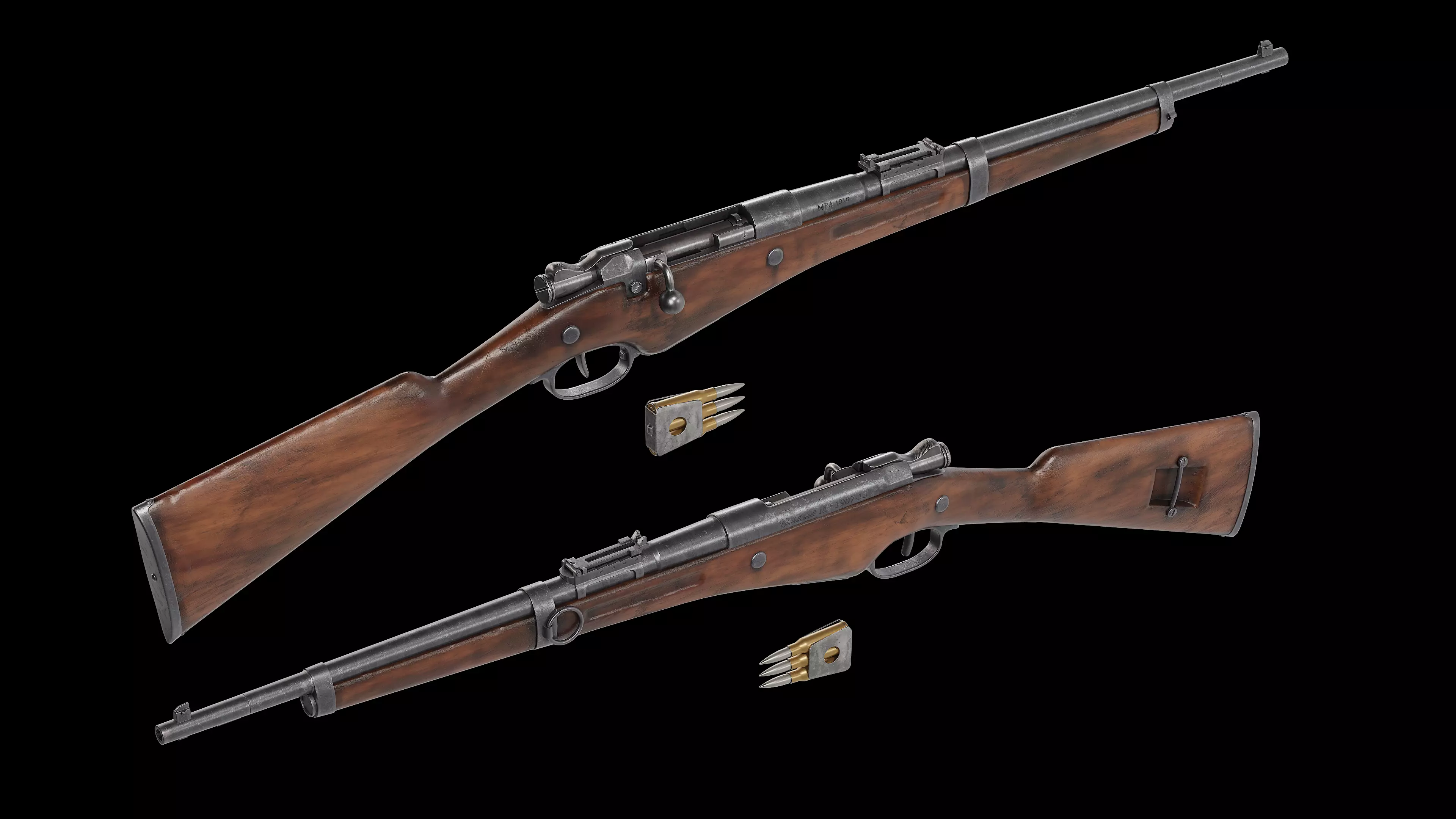 The Berthier Model 1892 carbine was a compact bolt-action cavalry carbine adopted by the France in the late 19th century. Designed by French engineer Émile Berthier, it was developed to provide mounted troops with a lighter and shorter firearm than the standard infantry rifle. The weapon used the 8×50mmR Lebel cartridge and fed from a Mannlicher-style en-bloc clip inserted into an internal magazine, originally holding three rounds. Its simple, robust action and compact length made it well suited for cavalry, artillery crews, and other support troops. Variants of the carbine and its later modifications continued in service with French forces through World War I and beyond, with later updates increasing the magazine capacity to five rounds.