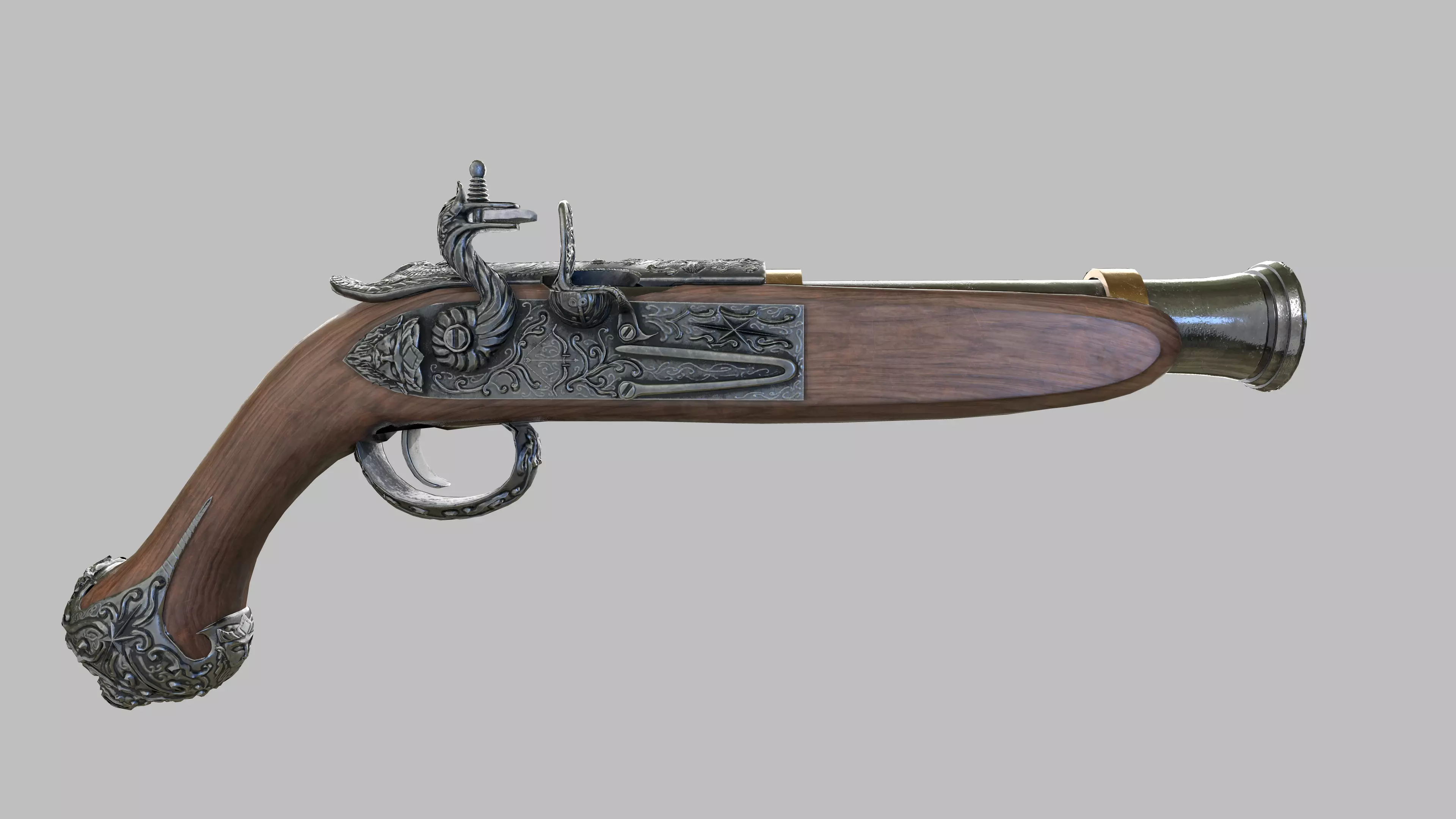A slightly stylized blunderbuss flintlock pistol with engraved details. Can be used with engineswith PBR support. Included textures for Unity5 and UnrealEngine4