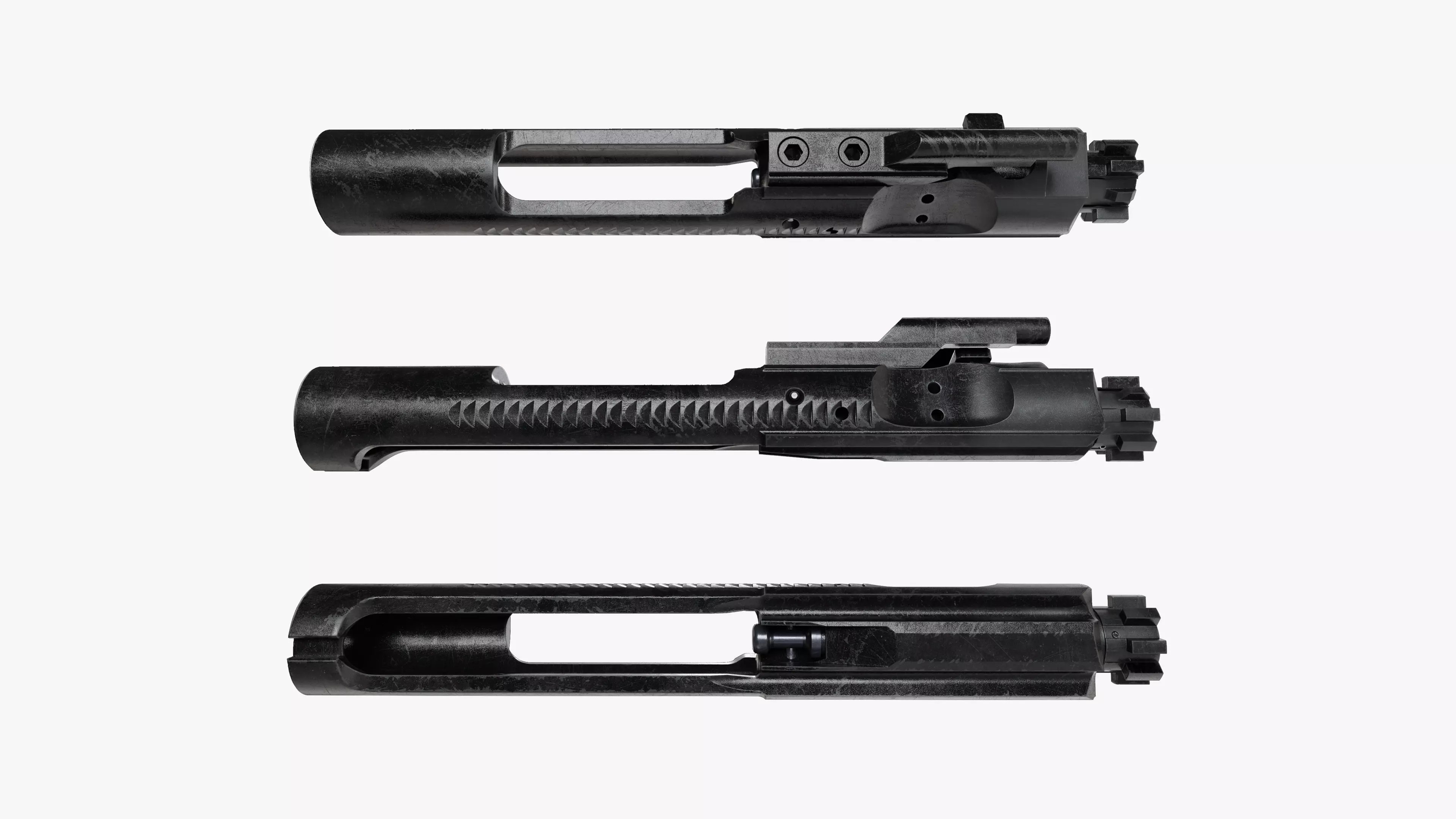 This is a high quality subdividable model of the bolt carrier group to fit an M4, AR15 or M16.All components of the model are quads and tris only and seperated and logically named for ease of animation and scene management. The model is 48,898 Polygons 48,806 Verts, The model is all non Overlapping UVs The model has 4k physically accurate PBR materials with a great level of detail making them perfect for extreme close ups and hi def rendering. Model has great topology and will respond well to rigging and animation. All parts of the mesh are closed Meaning you can print them if you choose.