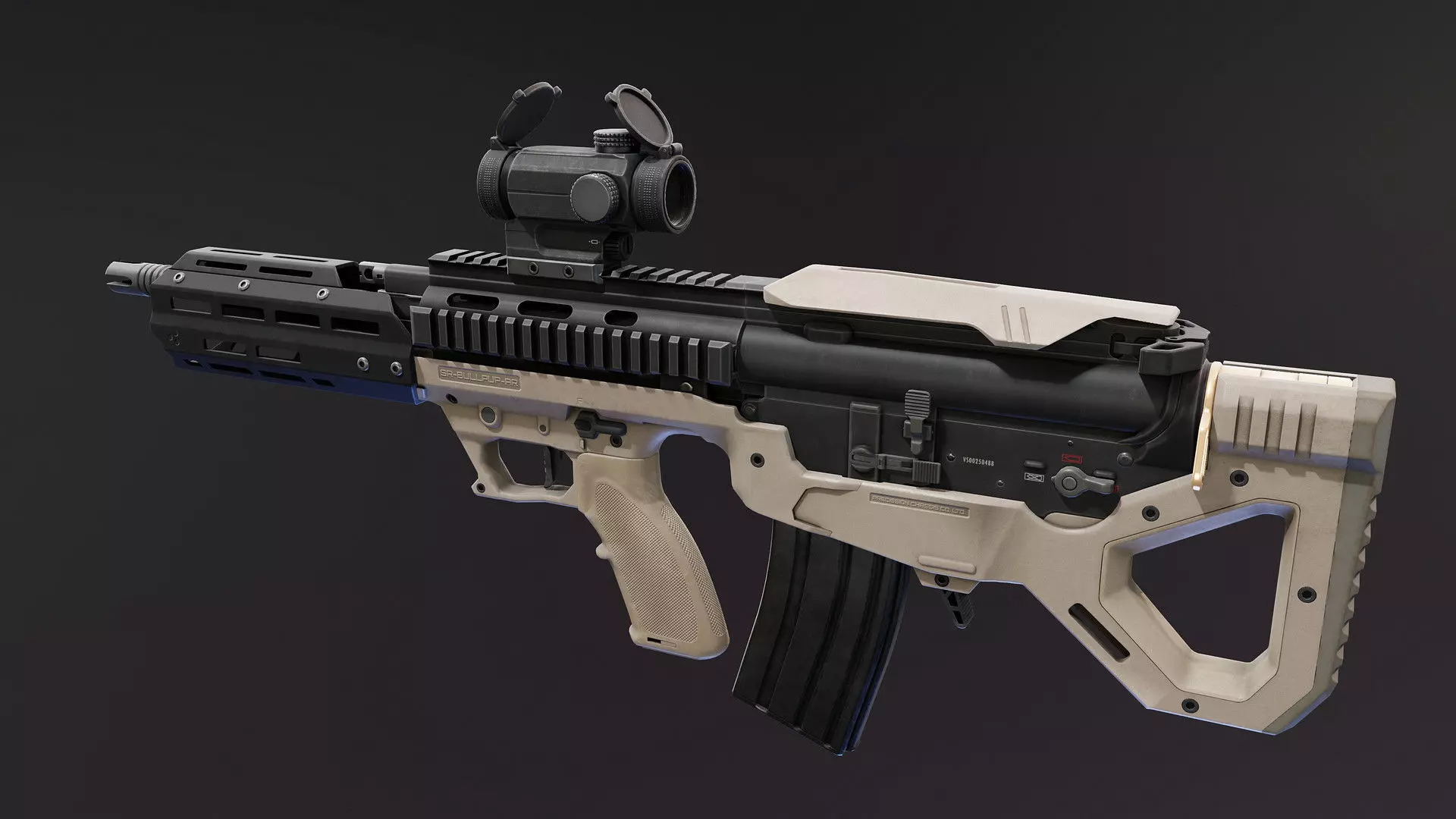 It has one separate 4K PBR Material for the chassis itself. Four PBR Materials for rifle, one 4K for reddot and one 2K for lenses. The Bullpup kit also came with Black and FDE textures.