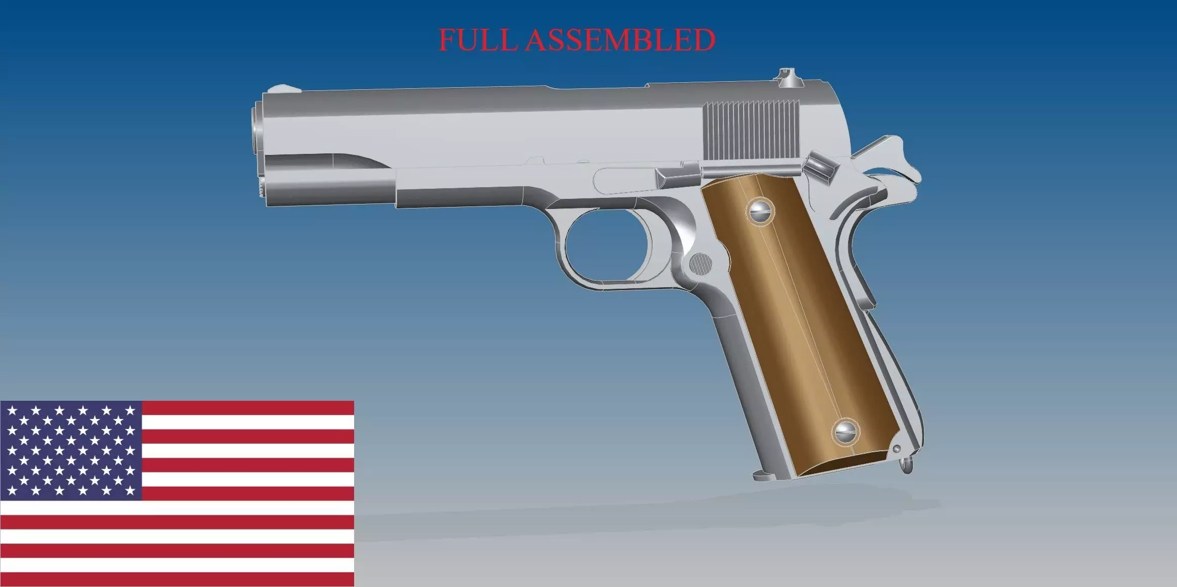 Full assembled model of American pistol and its 45 ACP bullet.