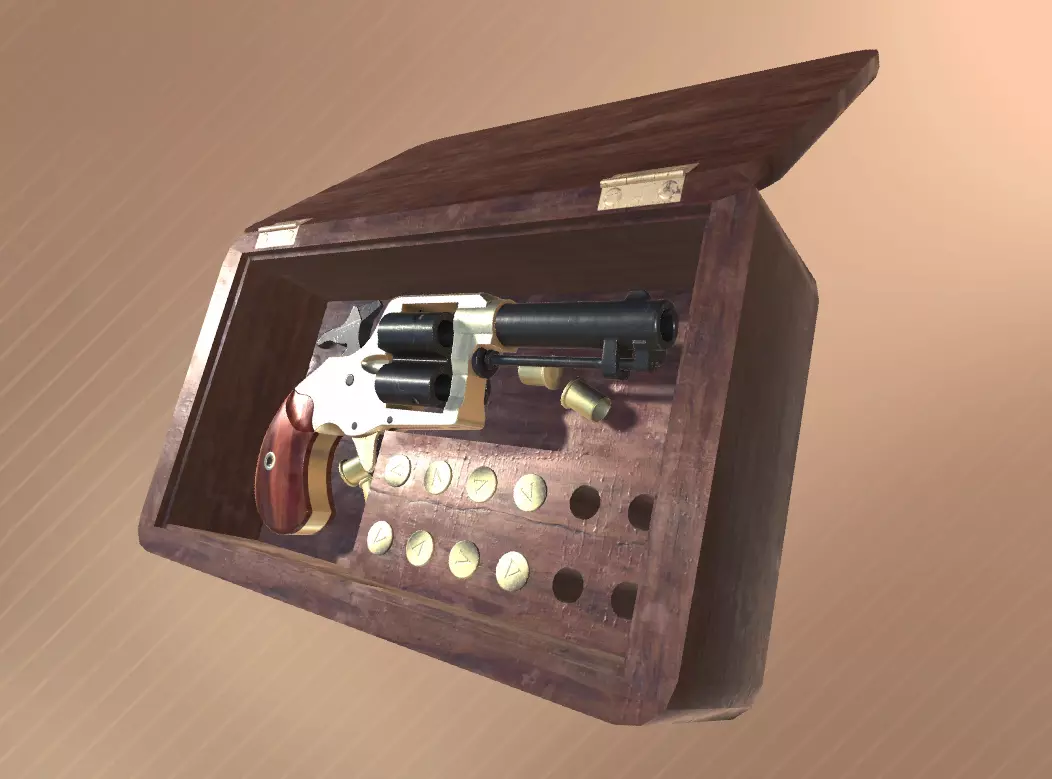 Vintage PBR handgun ideal for any Wild West environment. The revolver comes in stylish wooden box with .41 cal. bullet and casing meshes. Includes shooting and reloading animation.