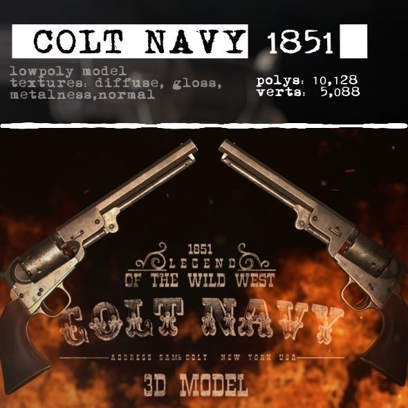 Colt Navy 1851. Lowpoly model. The trigger, hammer, Loading Lever and cylinder made separately, so easy for animating if need so. The pack includes diffuse, gloss, metalness and normal maps.