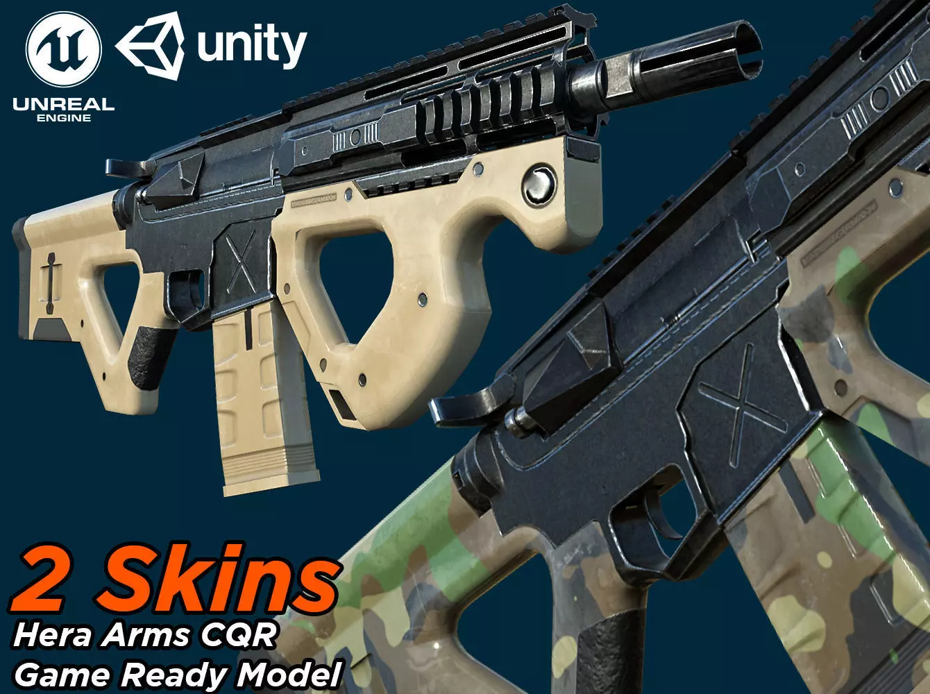 Game-Ready Model and 2 Texture sets (Skins) for the Gen1 CQR (Close Quarters Rifle) Intended and Optimized for FPS and TPS games.